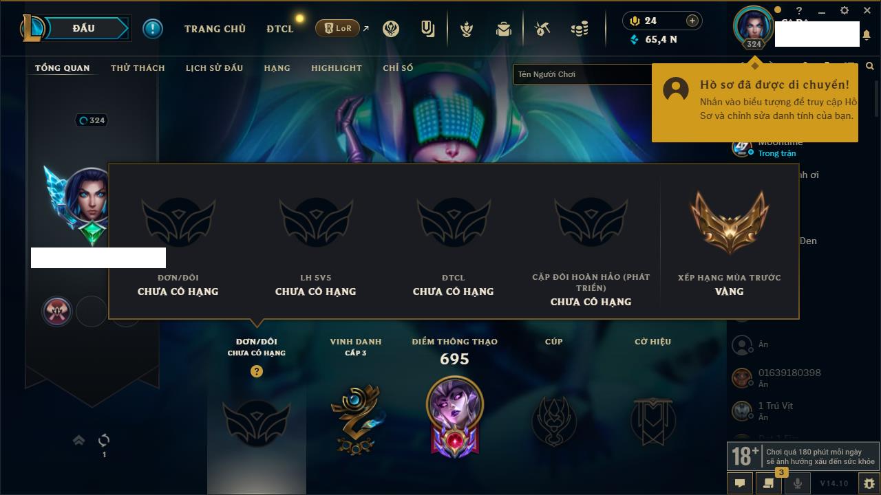 Rank Đơn: Chưa Rank Khung: Bạc Tướng: 171 - Còn 140501 THX Trang Phục: 58 Rank ĐTCL: Chưa Rank Linh Thú: 87