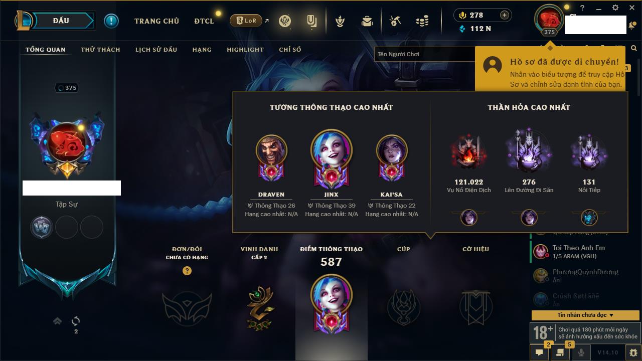 Rank Đơn: Chưa RankKhung: Chưa có khungTướng: 157 - Còn 6783 THXTrang Phục: 50Rank ĐTCL: Chưa RankLinh Thú: 37