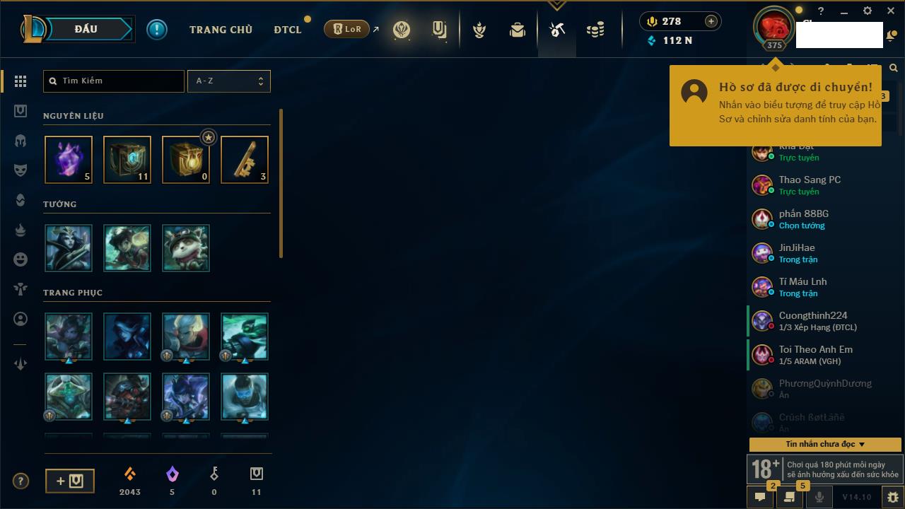 Rank Đơn: Đồng IIKhung: Chưa có khungTướng: 170 - Còn 56487 THXTrang Phục: 90Rank ĐTCL: Chưa RankLinh Thú: 129