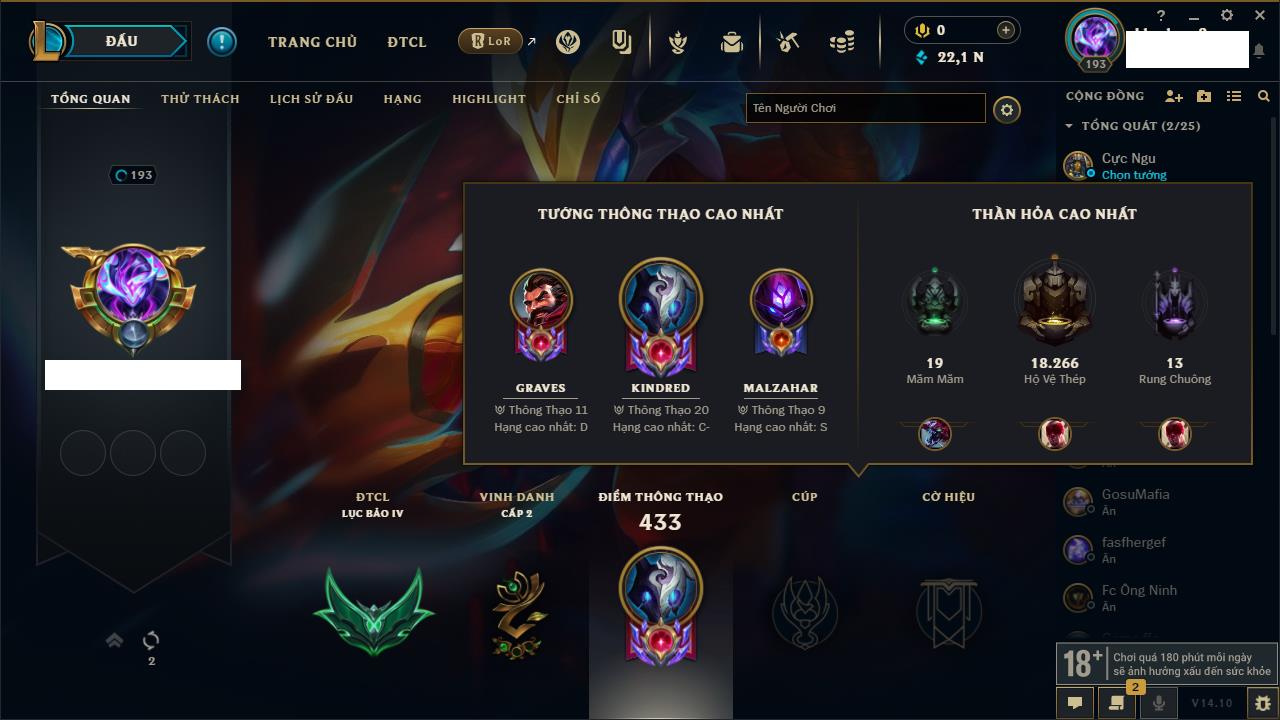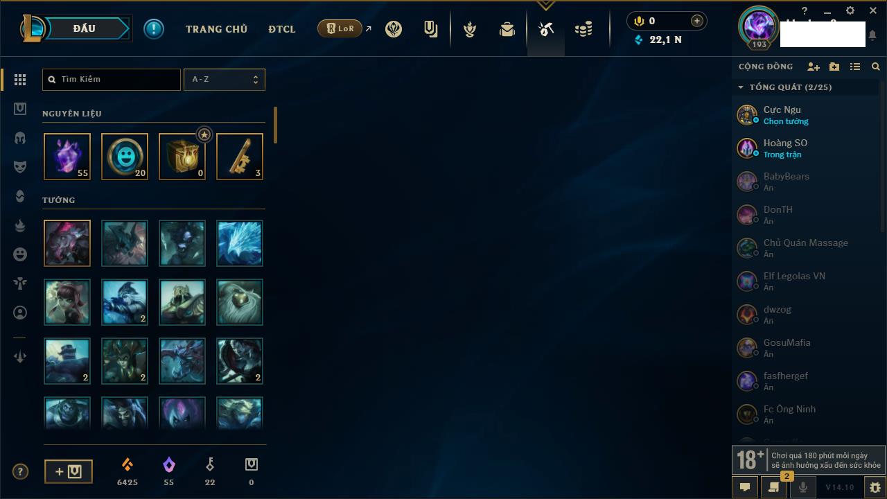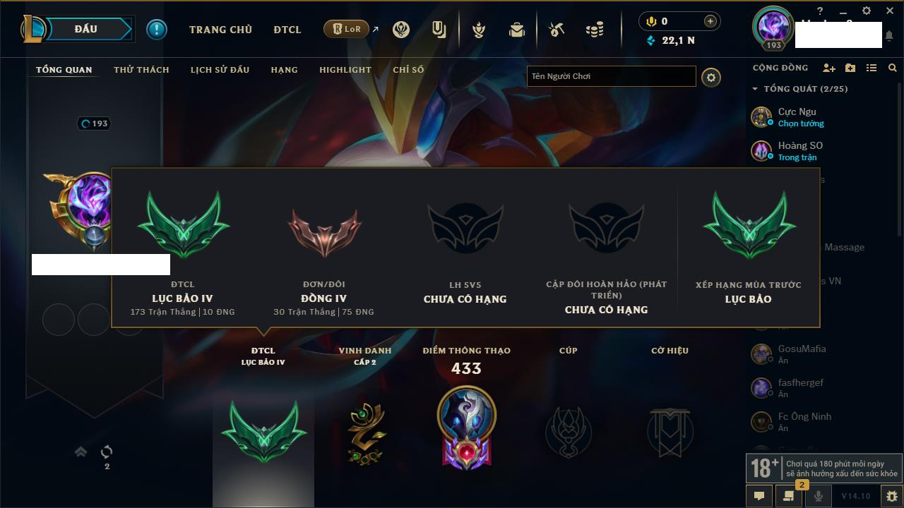 Rank Đơn: Vàng IVKhung: VàngTướng: 146 - Còn 89110 THXTrang Phục: 63Rank ĐTCL: Vàng IIILinh Thú: 41