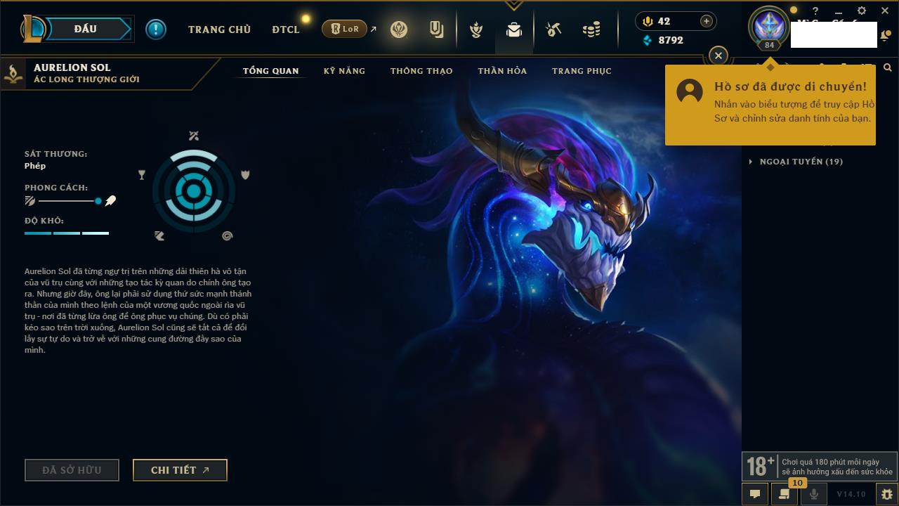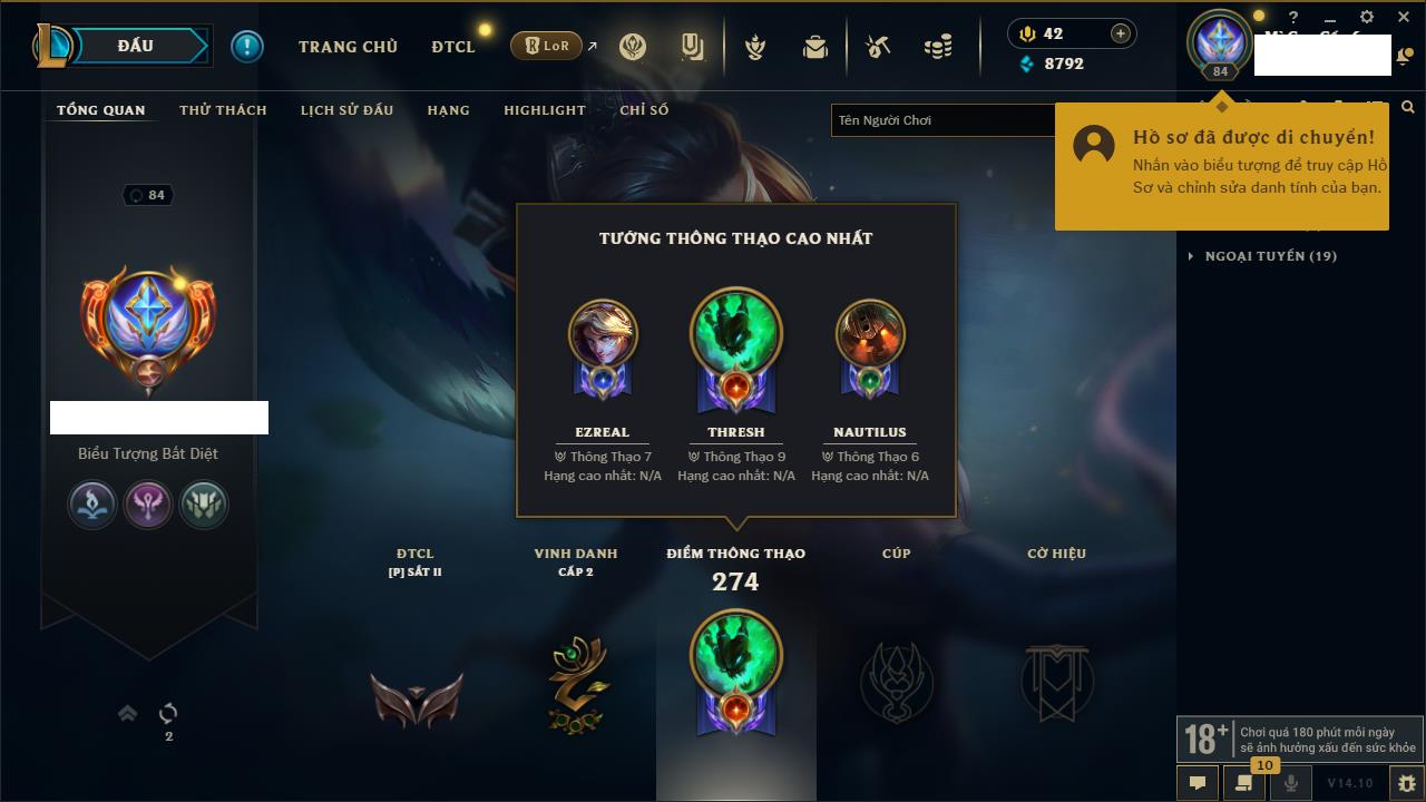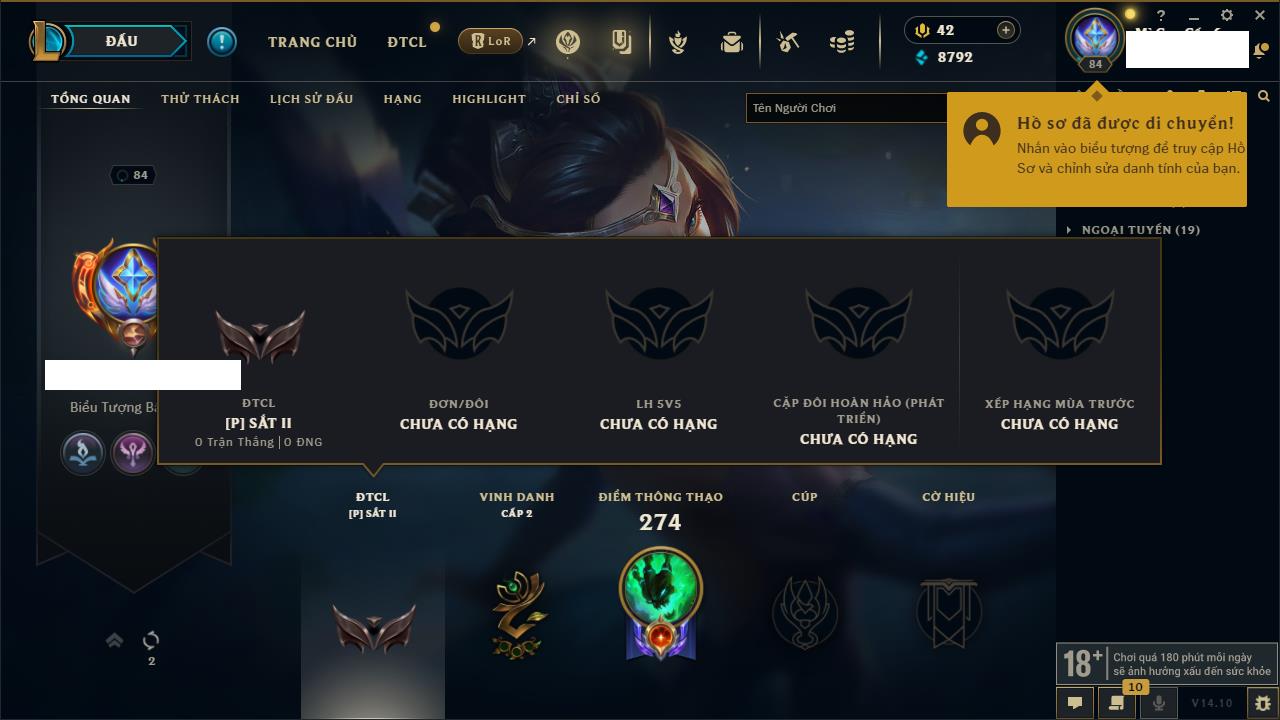 Rank Đơn: Chưa RankKhung: Chưa có khungTướng: 119 - Còn 8792 THXTrang Phục: 158Rank ĐTCL: Chưa RankLinh Thú: 37
