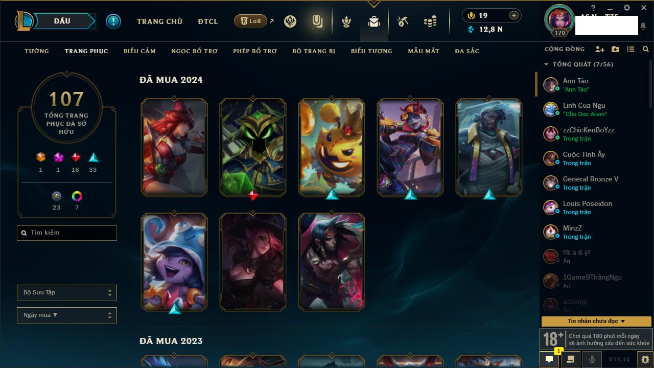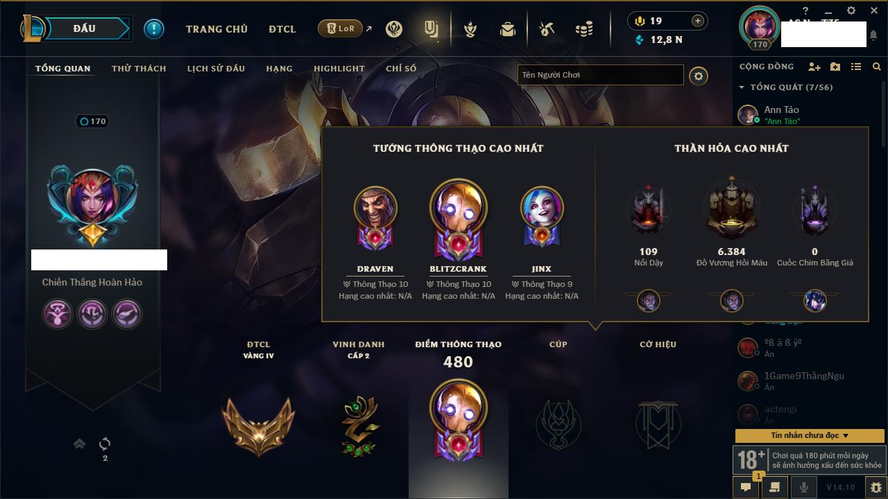 Rank Đơn: Đồng IIKhung: Chưa có khungTướng: 170 - Còn 56487 THXTrang Phục: 90Rank ĐTCL: Chưa RankLinh Thú: 129