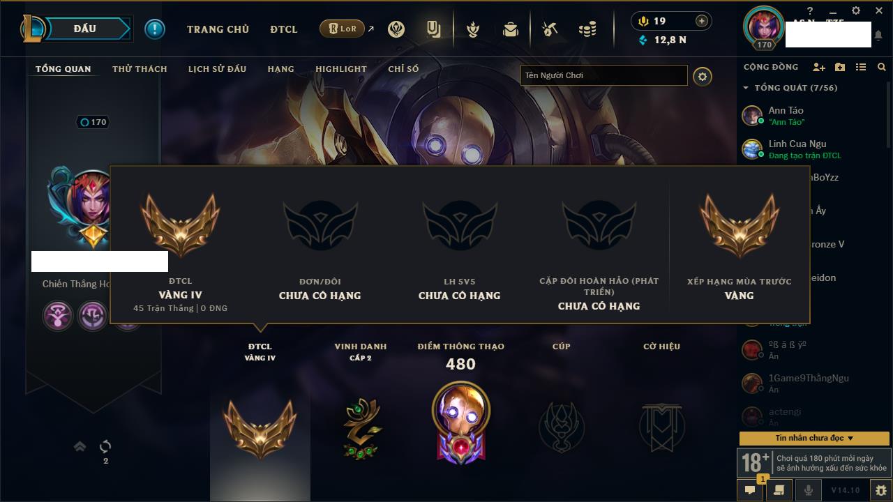Rank Đơn: Vàng IVKhung: VàngTướng: 146 - Còn 89110 THXTrang Phục: 63Rank ĐTCL: Vàng IIILinh Thú: 41