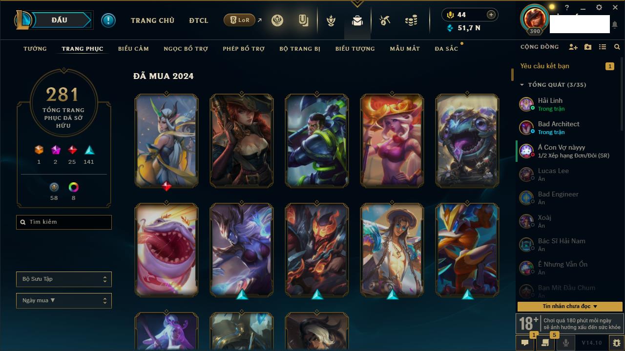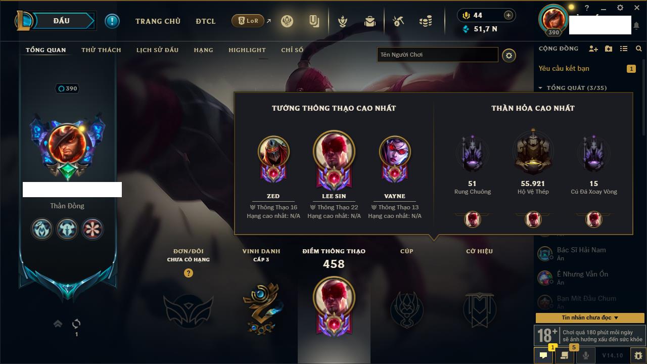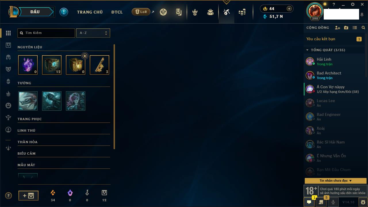 Rank Đơn: Vàng IIIKhung: Chưa có khungTướng: 171 - Còn 79750 THXTrang Phục: 288Rank ĐTCL: Chưa RankLinh Thú: 79