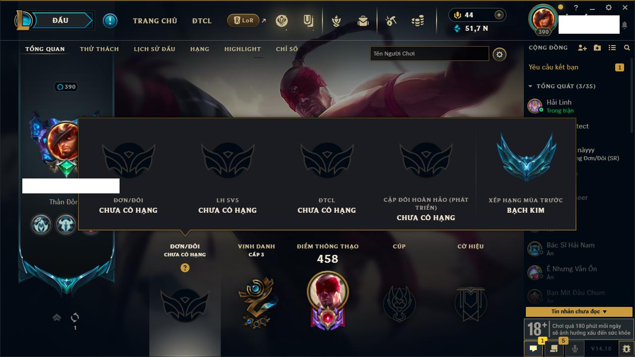 Rank Đơn: Bạch Kim IIIKhung: Bạch kimTướng: 170 - Còn 66107 THXTrang Phục: 201Rank ĐTCL: Chưa RankLinh Thú: 83
