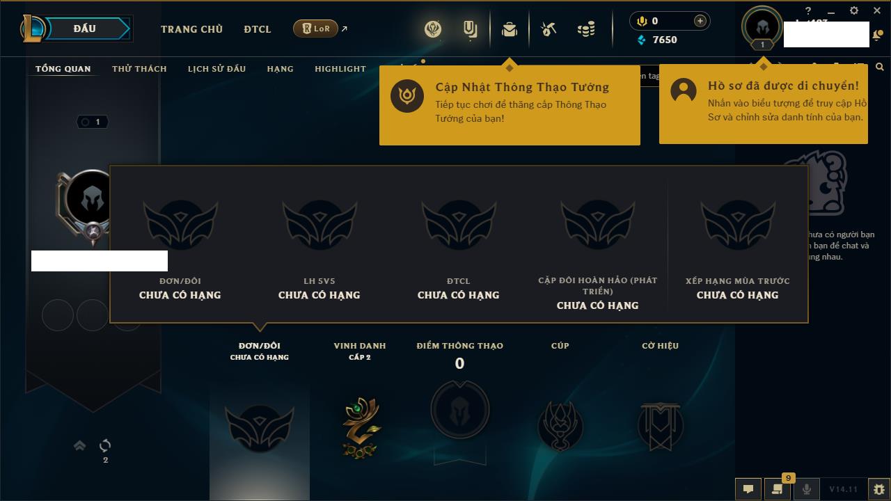 Rank Đơn: Chưa rank mùa nàoKhung: Chưa có khungTướng: 0 - Còn 2000 THXTrang Phục: 0Rank ĐTCL: Chưa RankLinh Thú: 19