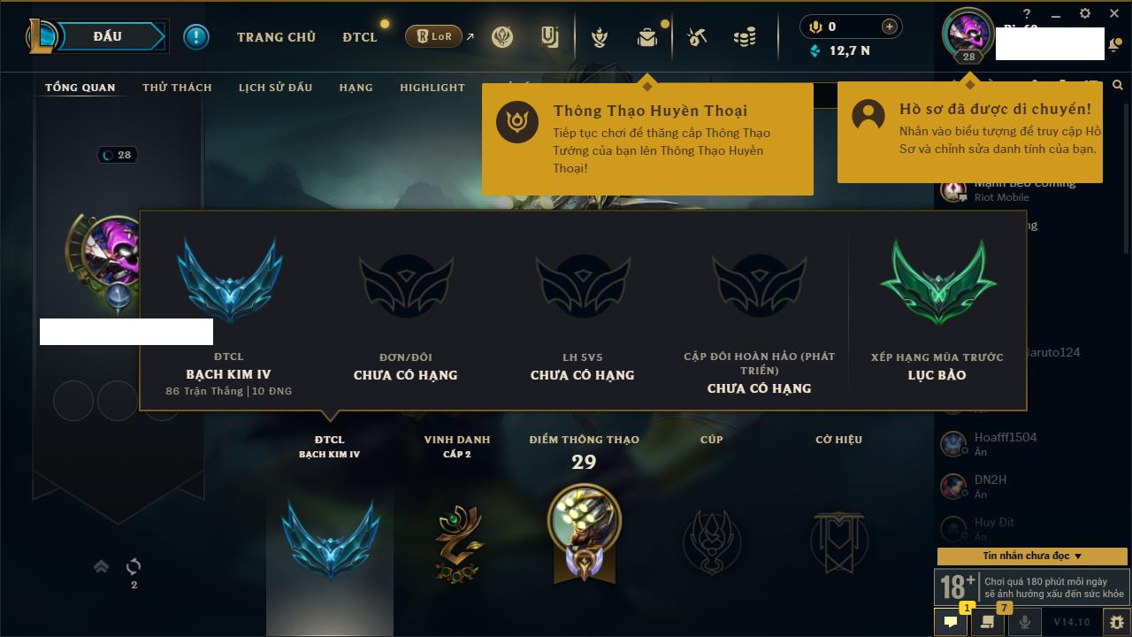 Rank Đơn: Chưa rank mùa nào Khung: Chưa có khung Tướng: 166 - Còn 3090 THX Trang Phục: 9 Rank ĐTCL: Chưa Rank Linh Thú: 125