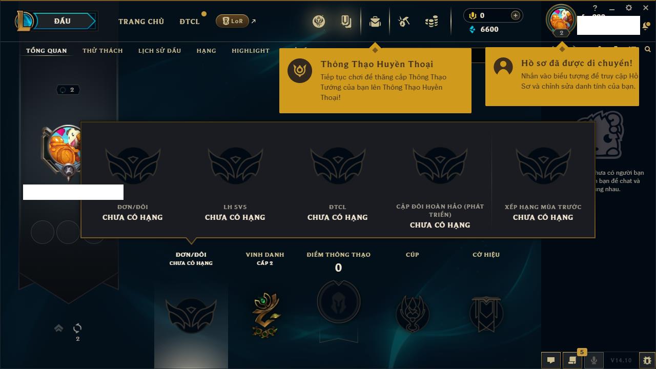 Rank Đơn: Chưa rank mùa nàoKhung: Chưa có khungTướng: 0 - Còn 2000 THXTrang Phục: 0Rank ĐTCL: Chưa RankLinh Thú: 19