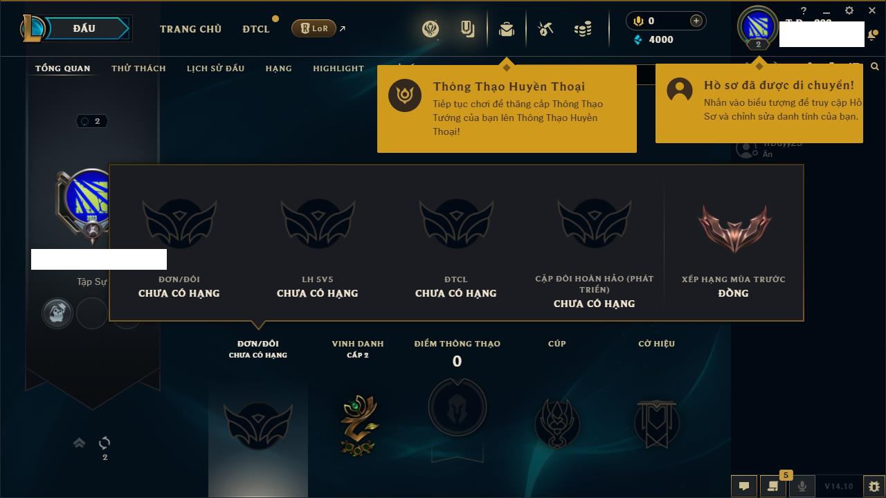 Rank Đơn: Chưa rank mùa nàoKhung: Chưa có khungTướng: 0 - Còn 2000 THXTrang Phục: 0Rank ĐTCL: Chưa RankLinh Thú: 19