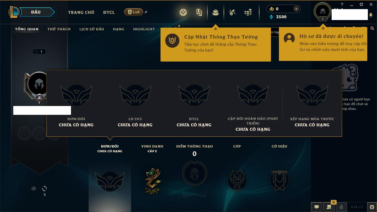 Rank Đơn: Chưa rank mùa nàoKhung: Chưa có khungTướng: 0 - Còn 3500 THXTrang Phục: 0Rank ĐTCL: Chưa RankLinh Thú: 5