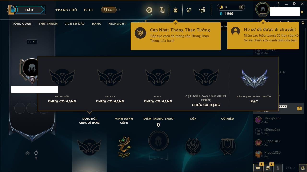 Rank Đơn: Chưa rank mùa nàoKhung: Chưa có khungTướng: 0 - Còn 2000 THXTrang Phục: 0Rank ĐTCL: Chưa RankLinh Thú: 19