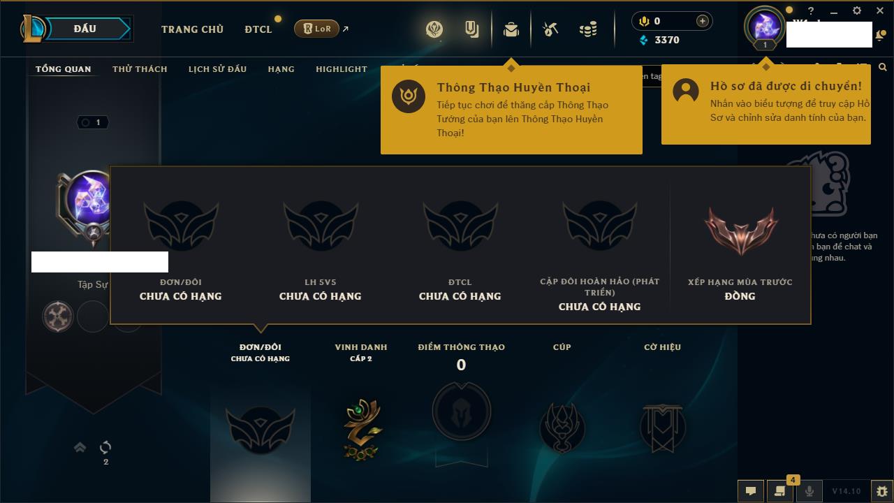 Rank Đơn: Chưa rank mùa nàoKhung: Chưa có khungTướng: 0 - Còn 4650 THXTrang Phục: 0Rank ĐTCL: Chưa RankLinh Thú: 37
