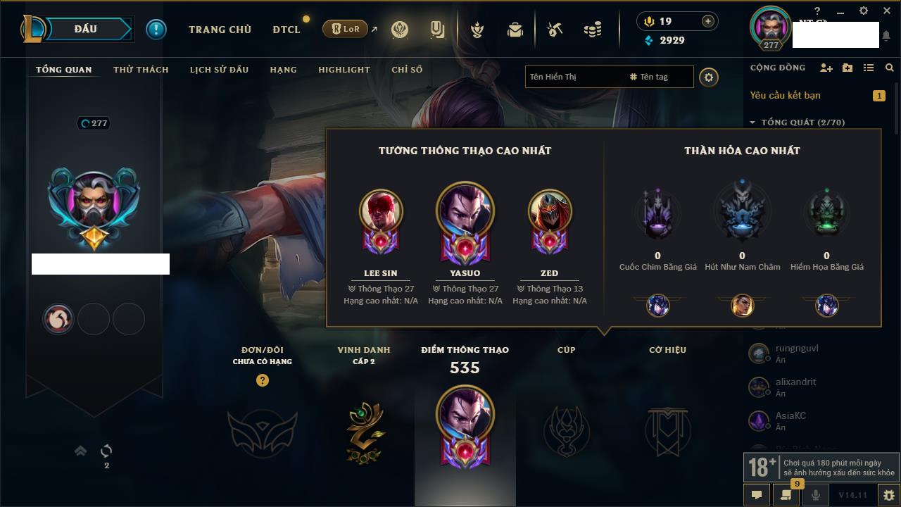 Rank Đơn: Đồng IIKhung: Chưa có khungTướng: 170 - Còn 56487 THXTrang Phục: 90Rank ĐTCL: Chưa RankLinh Thú: 129