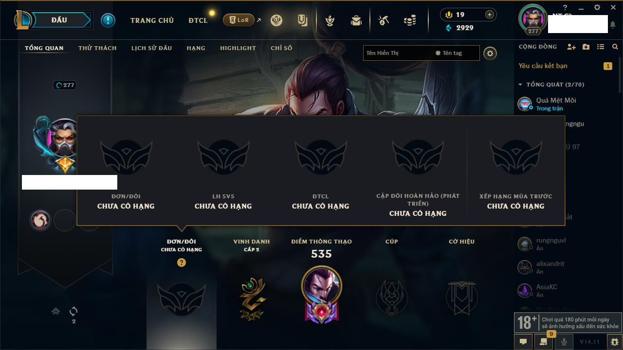 Rank Đơn: Vàng IVKhung: VàngTướng: 146 - Còn 89110 THXTrang Phục: 63Rank ĐTCL: Vàng IIILinh Thú: 41
