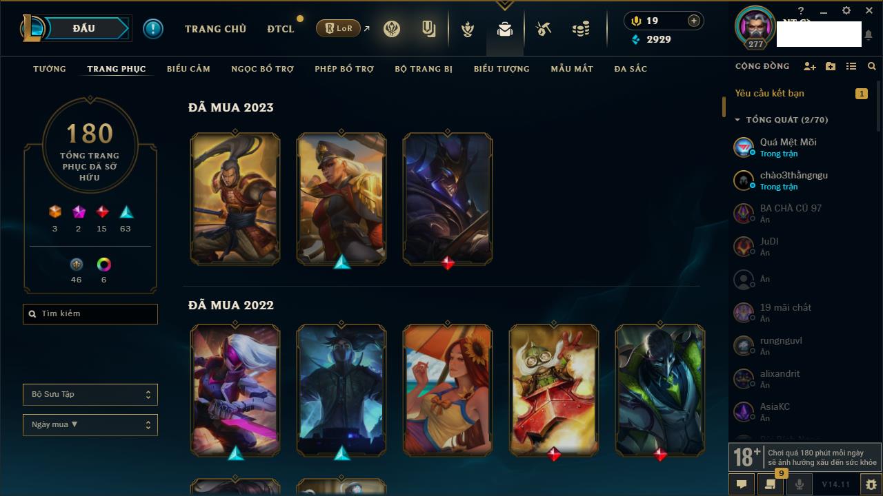 Rank Đơn: Vàng IIIKhung: VàngTướng: 170 - Còn 33222 THXTrang Phục: 136Rank ĐTCL: Chưa RankLinh Thú: 40