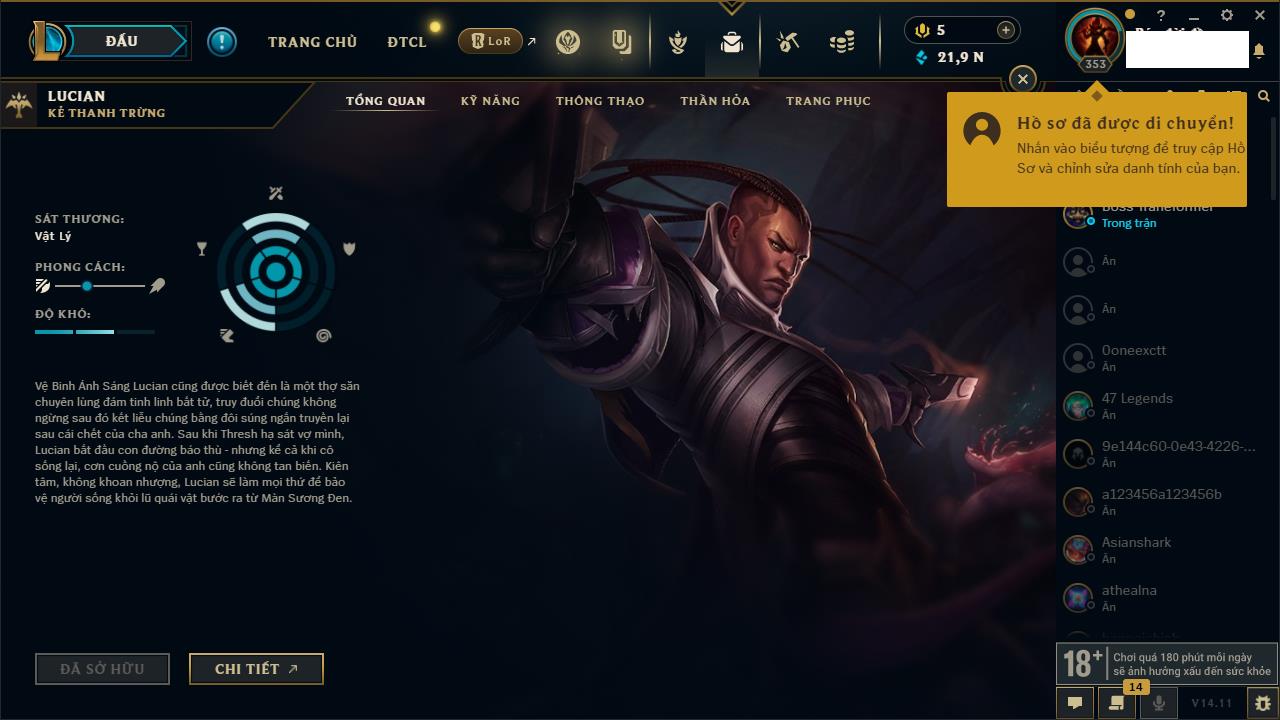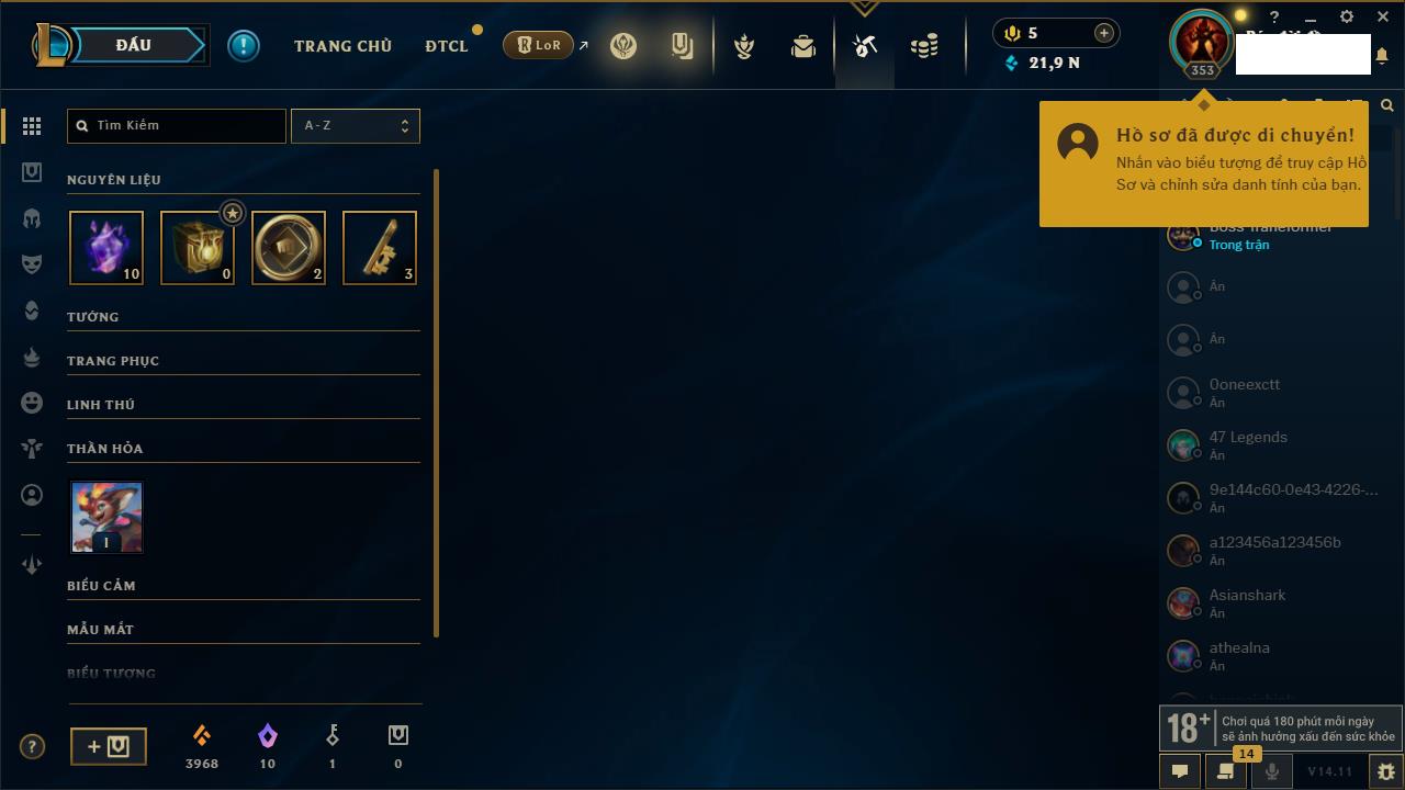 Rank Đơn: Chưa RankKhung: Chưa có khungTướng: 170 - Còn 140067 THXTrang Phục: 165Rank ĐTCL: Chưa RankLinh Thú: 51