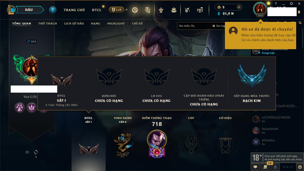 Rank Đơn: Chưa RankKhung: Chưa có khungTướng: 2 - Còn 26550 THXTrang Phục: 0Rank ĐTCL: Chưa RankLinh Thú: 23