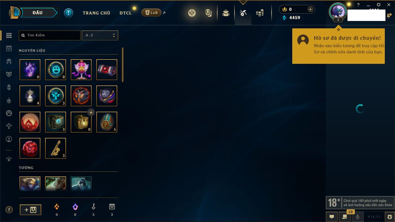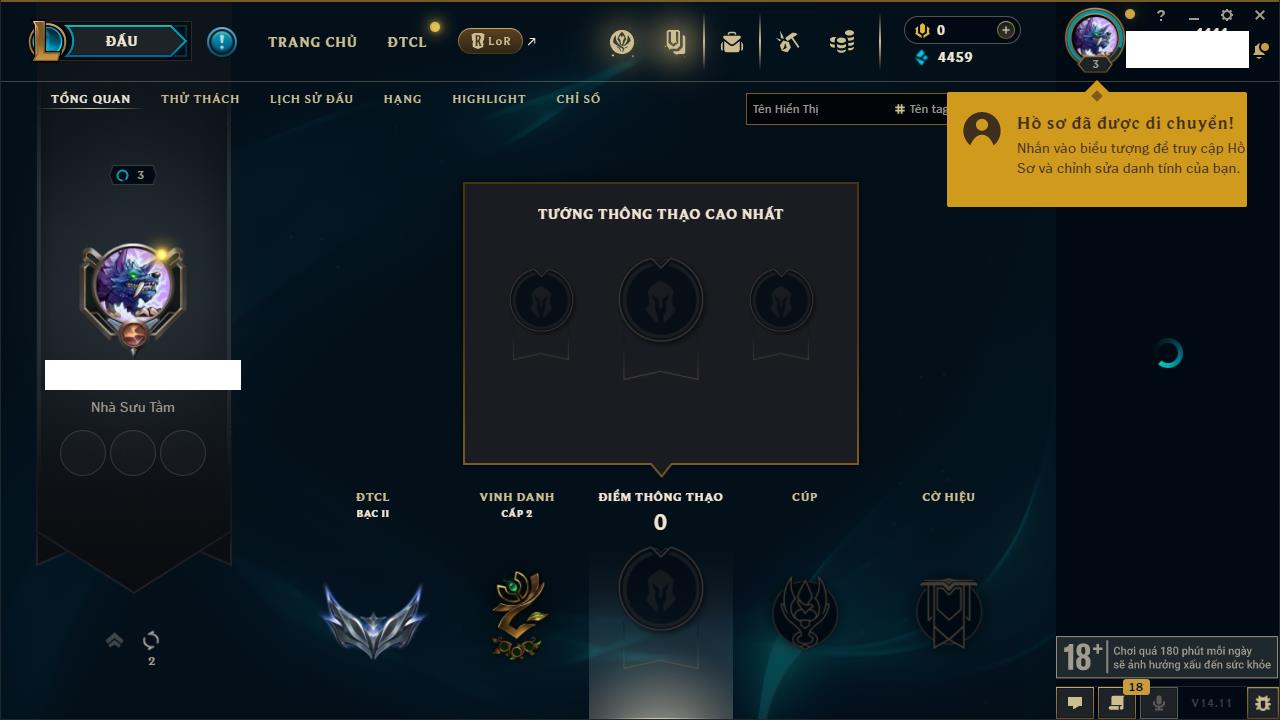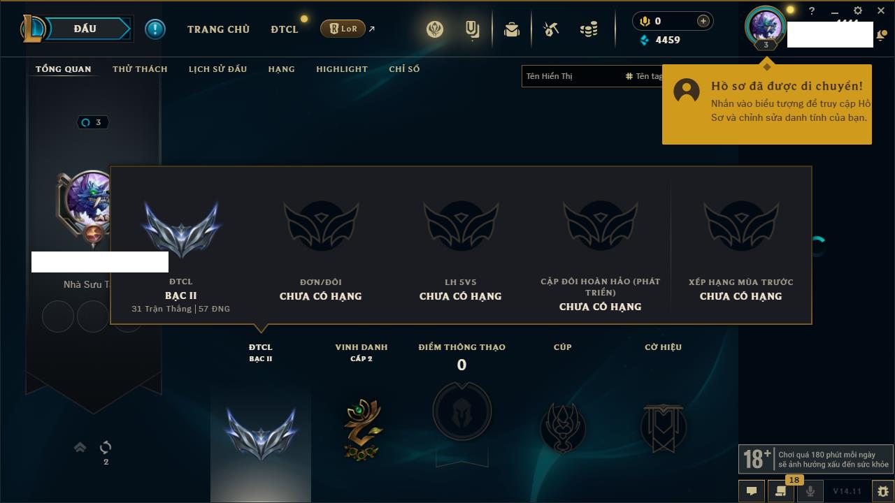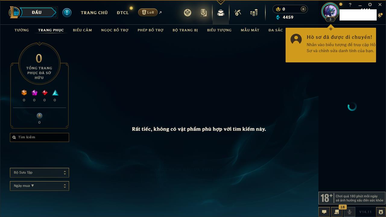Rank Đơn: Chưa RankKhung: Chưa có khungTướng: 143 - Còn 595 THXTrang Phục: 114Rank ĐTCL: Chưa RankLinh Thú: 65