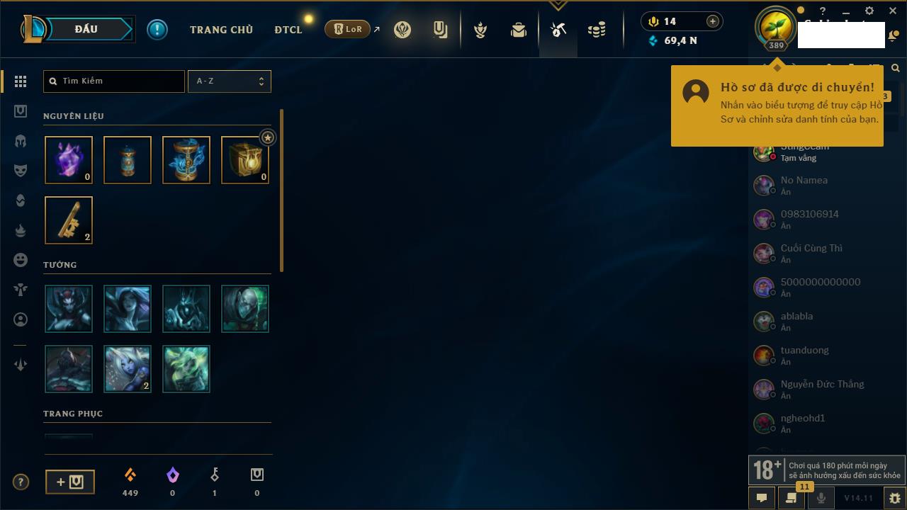 Rank Đơn: Chưa RankKhung: Chưa có khungTướng: 65 - Còn 2075 THXTrang Phục: 10Rank ĐTCL: Chưa RankLinh Thú: 72