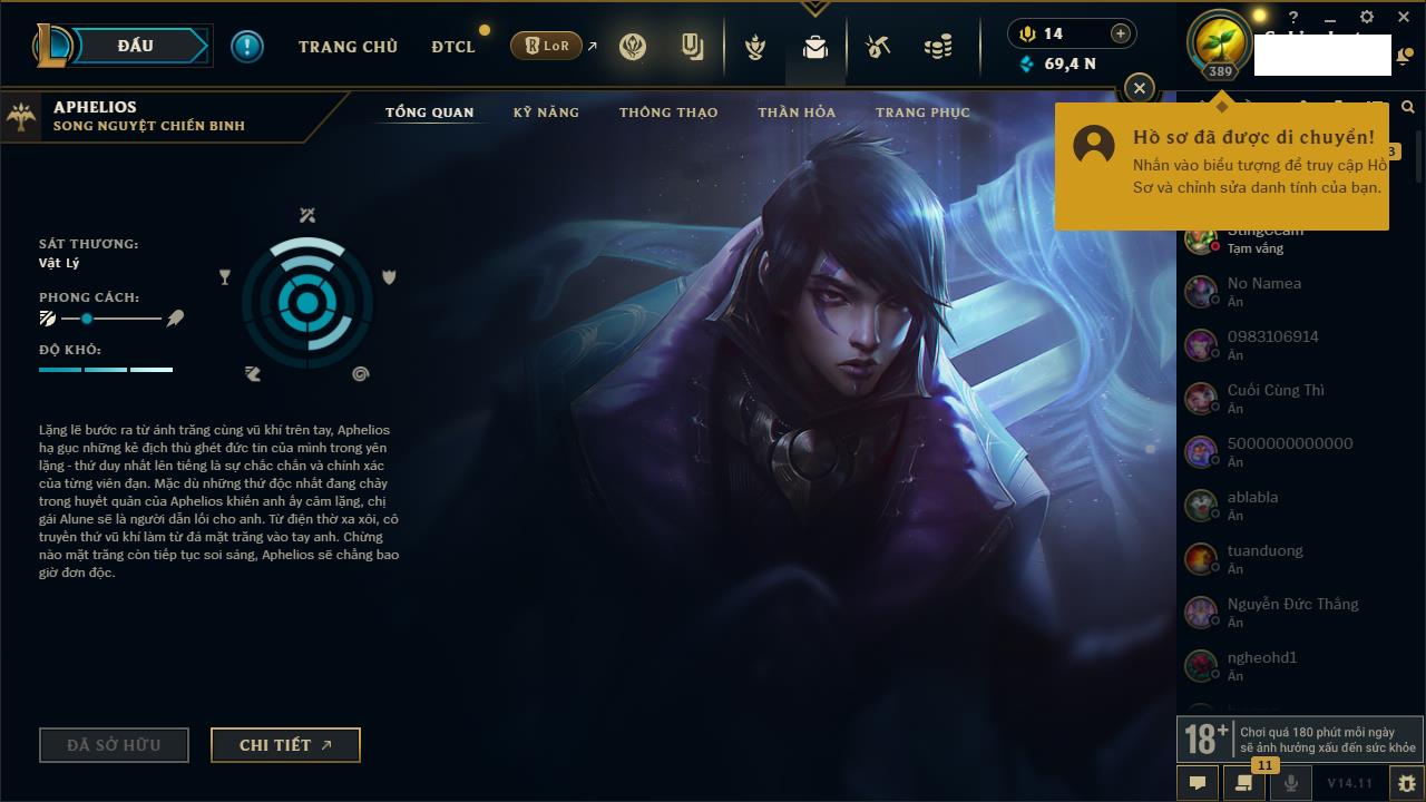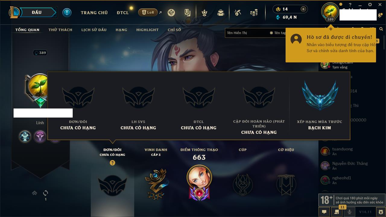 Rank Đơn: Chưa RankKhung: Chưa có khungTướng: 170 - Còn 13795 THXTrang Phục: 75Rank ĐTCL: Chưa RankLinh Thú: 176
