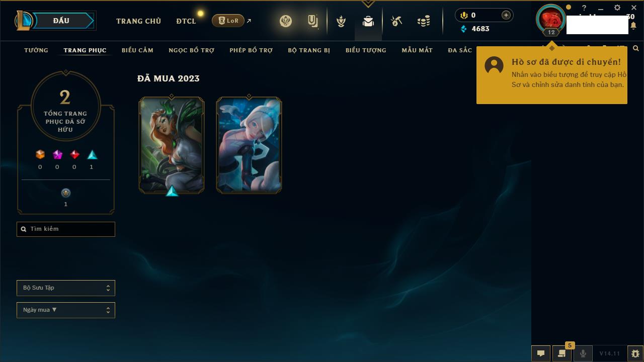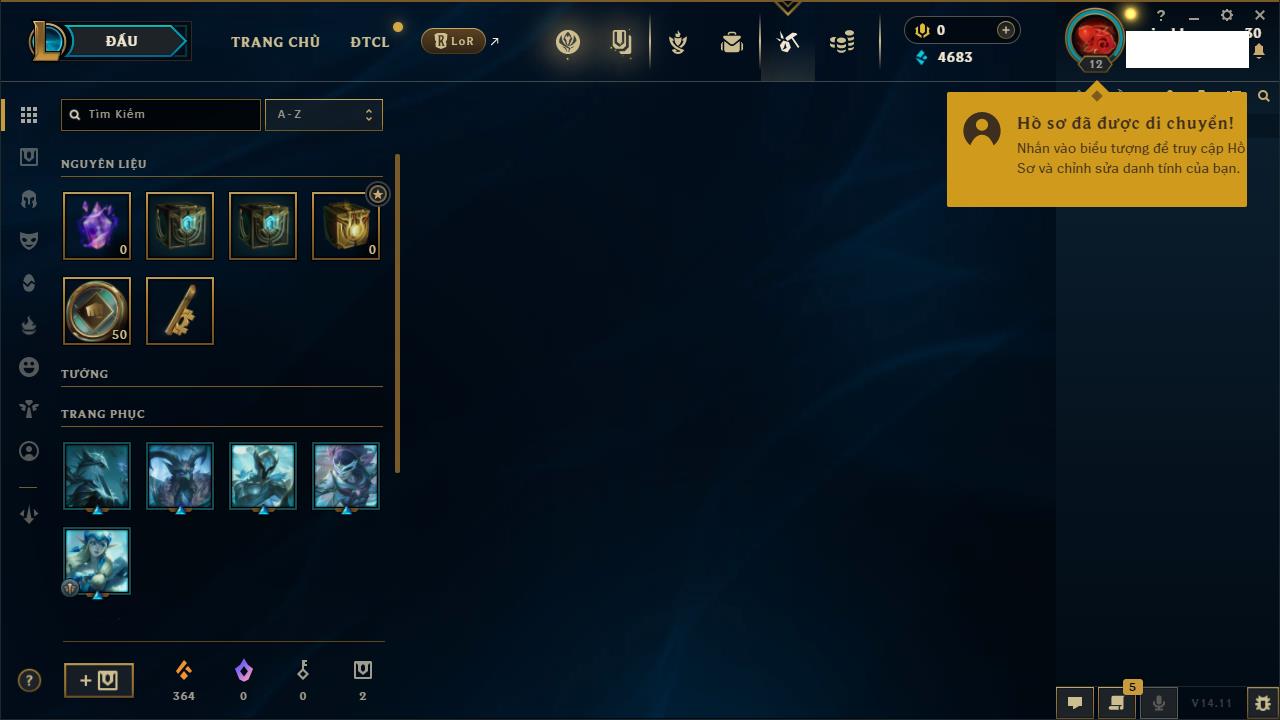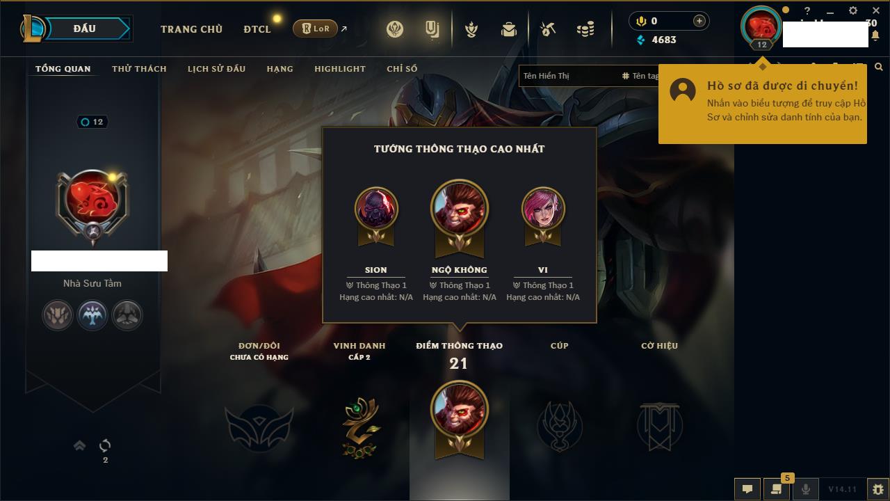 Rank Đơn: Chưa rank mùa nàoKhung: Chưa có khungTướng: 1 - Còn 9000 THXTrang Phục: 0Rank ĐTCL: Bạch Kim IIILinh Thú: 14