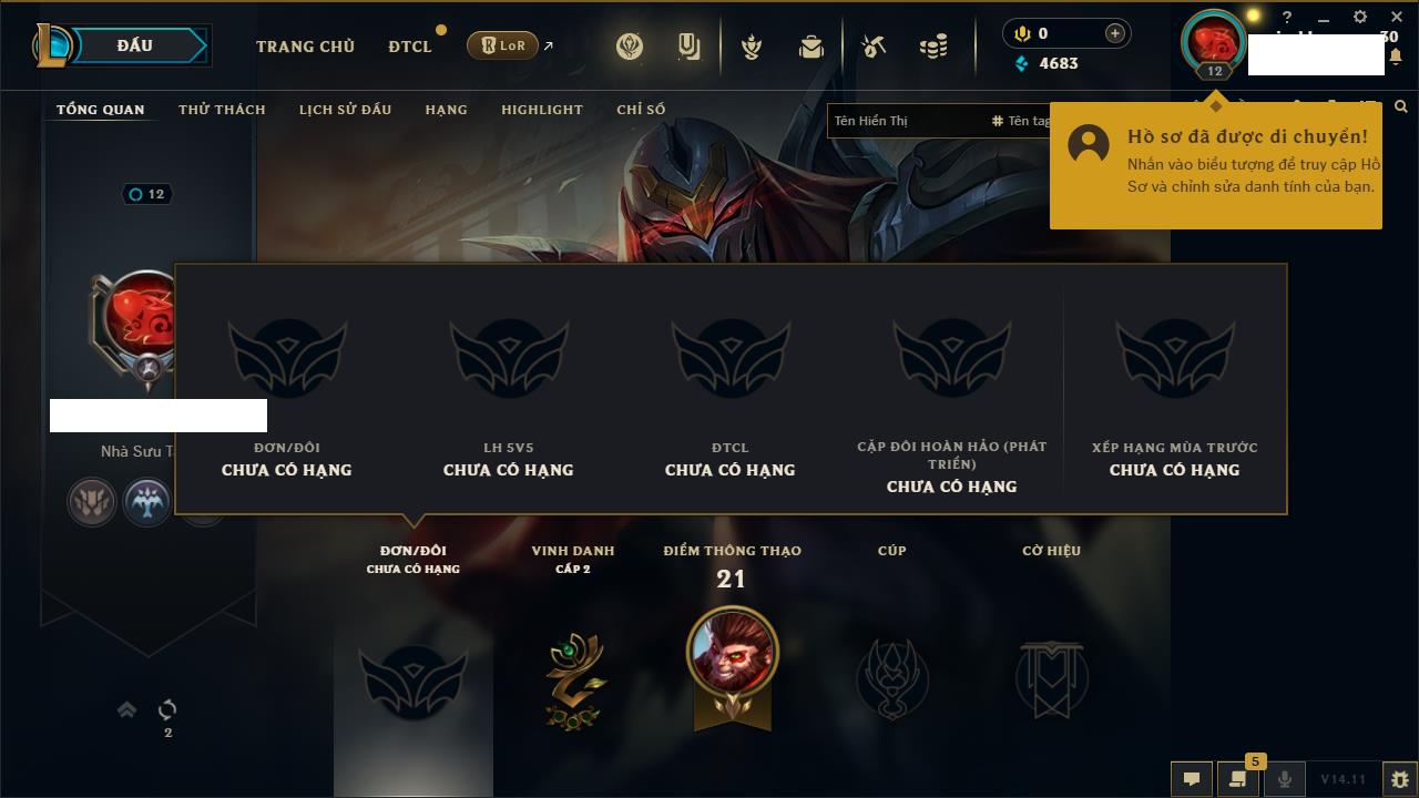 Rank Đơn: Chưa rank mùa nàoKhung: Chưa có khungTướng: 4 - Còn 12000 THXTrang Phục: 0Rank ĐTCL: Bạch Kim IIILinh Thú: 20
