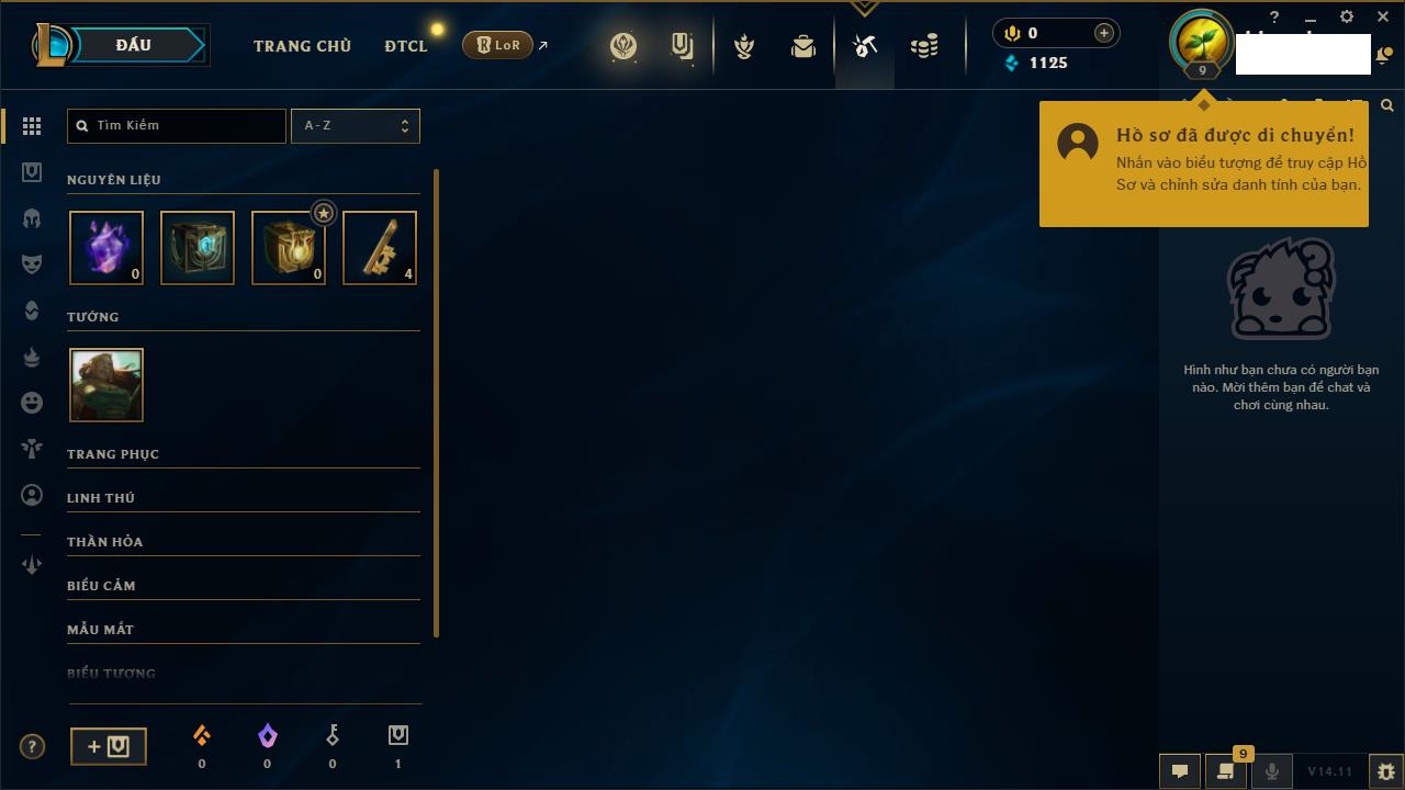 Rank Đơn: Vàng IVKhung: VàngTướng: 171 - Còn 48721 THXTrang Phục: 171Rank ĐTCL: Chưa RankLinh Thú: 27