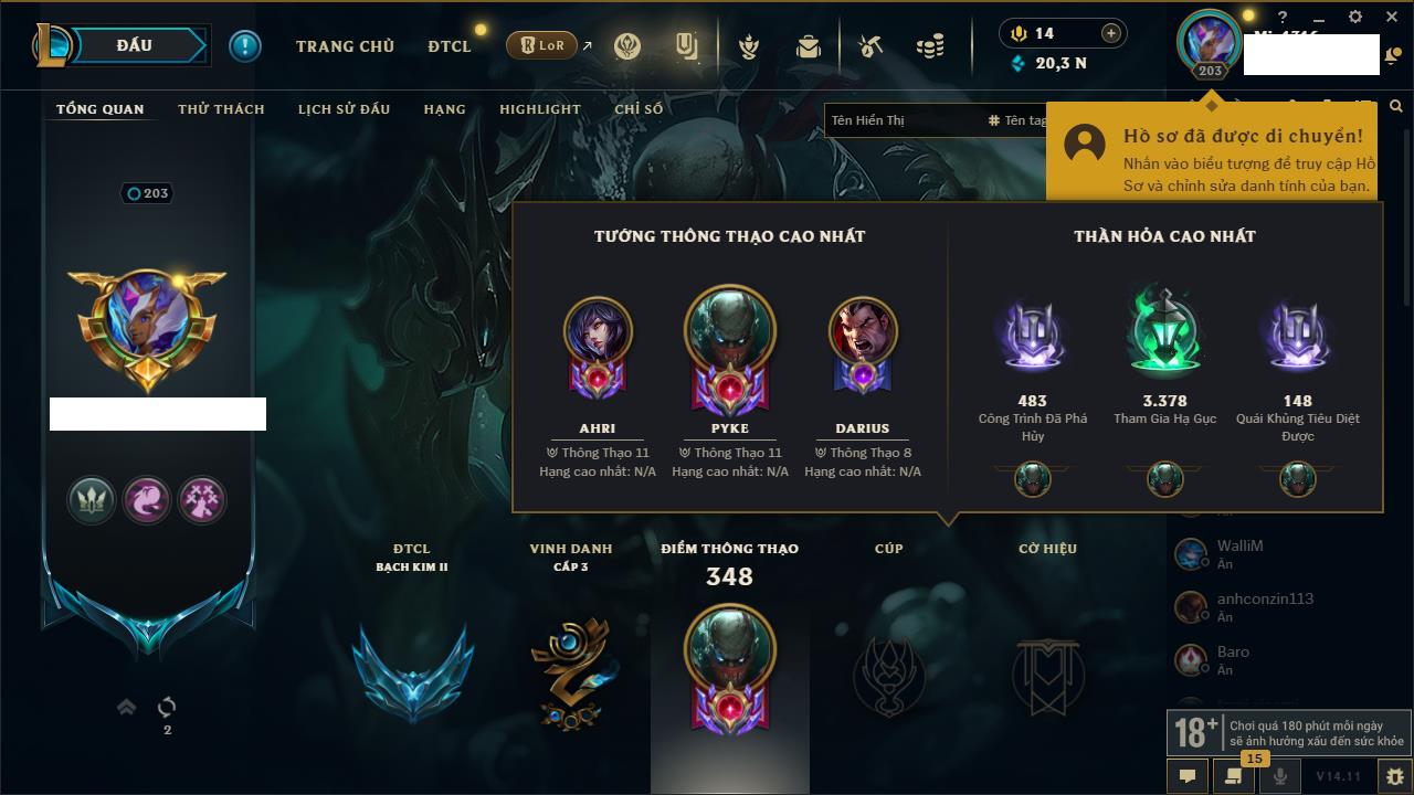 Rank Đơn: Bạc IIKhung: VàngTướng: 171 - Còn 332462 THXTrang Phục: 165Rank ĐTCL: Kim Cương IVLinh Thú: 181