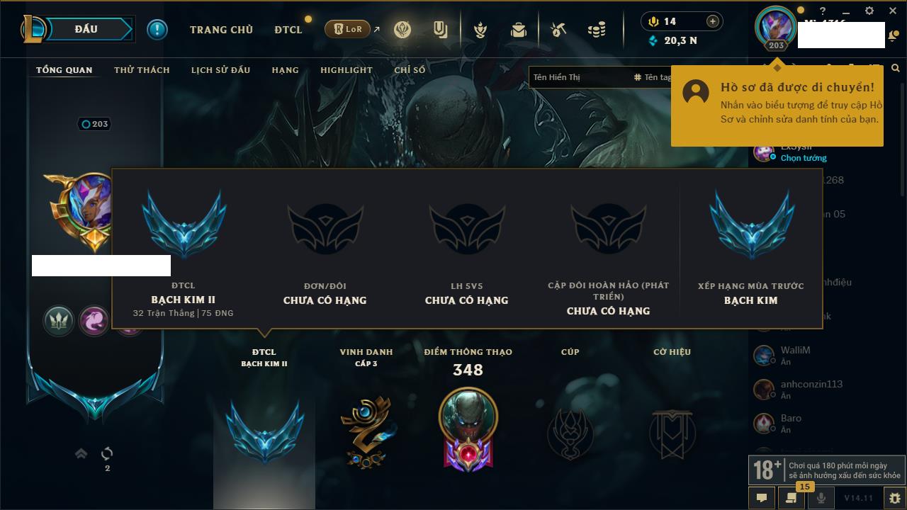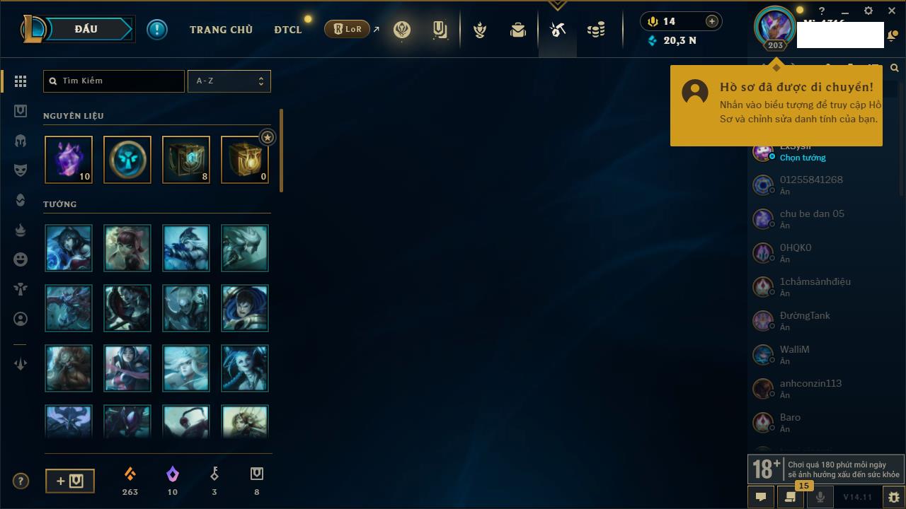 Rank Đơn: Vàng IVKhung: BạcTướng: 171 - Còn 231097 THXTrang Phục: 180Rank ĐTCL: Vàng IVLinh Thú: 110