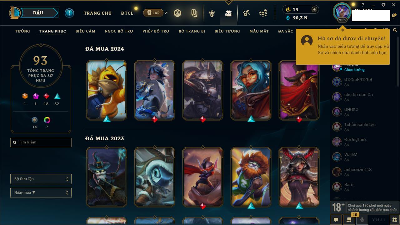 Rank Đơn: Bạc IVKhung: VàngTướng: 172 - Còn 358384 THXTrang Phục: 177Rank ĐTCL: Lục Bảo IILinh Thú: 211