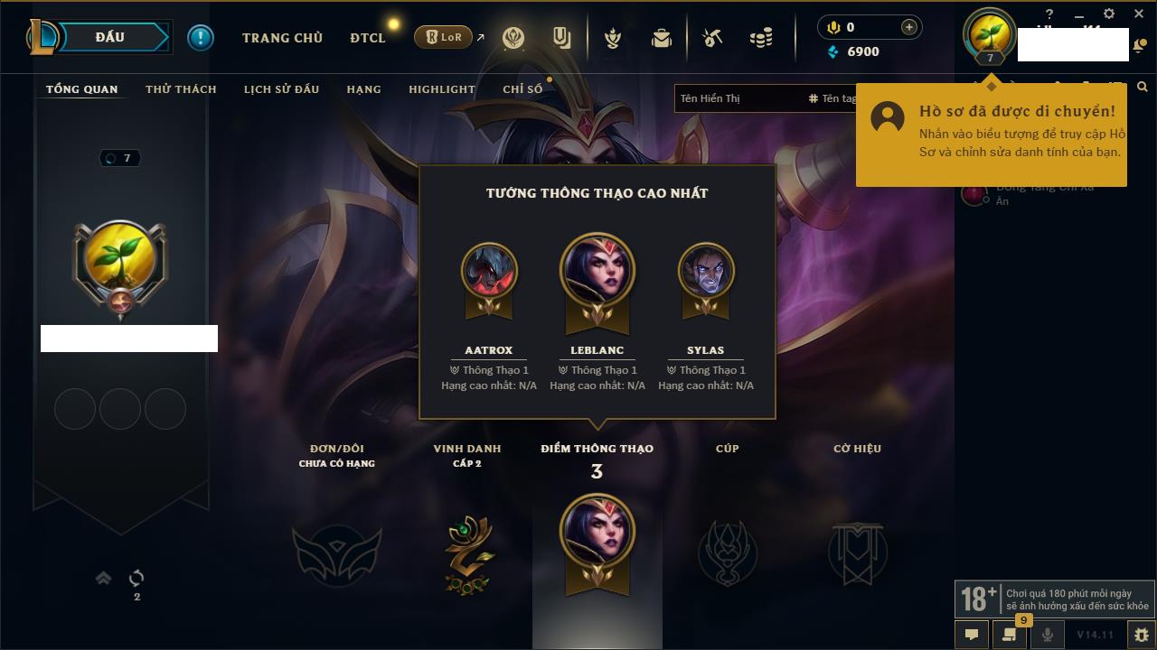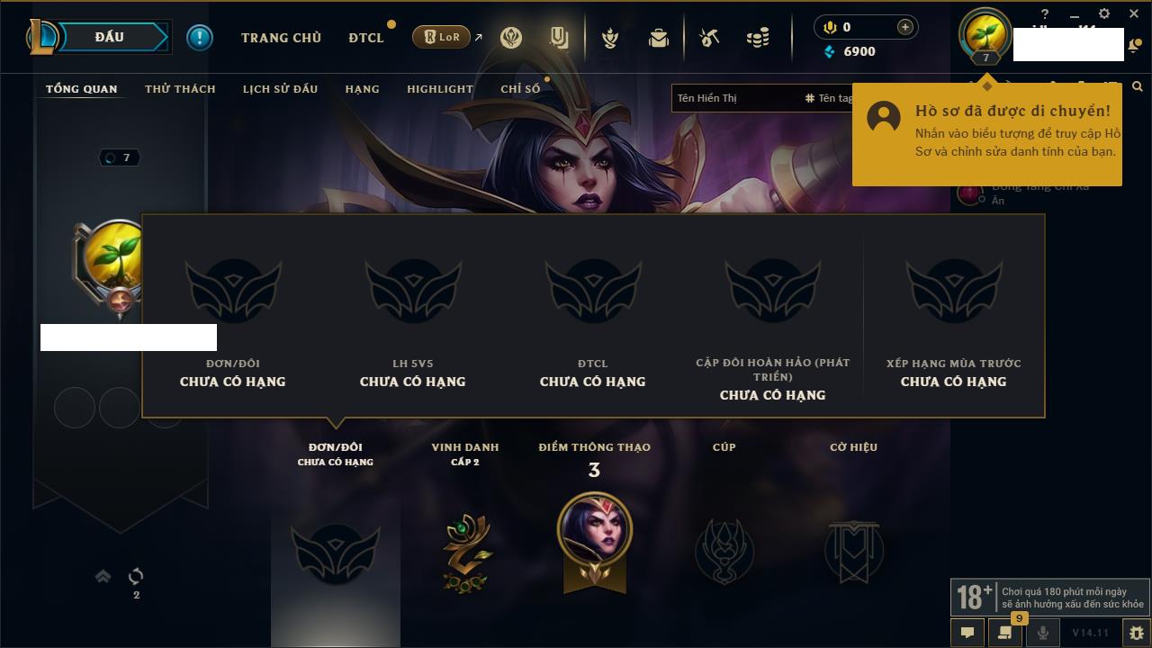 Rank Đơn: Chưa rank mùa nàoKhung: Chưa có khungTướng: 157 - Còn 6900 THXTrang Phục: 0Rank ĐTCL: Chưa RankLinh Thú: 17