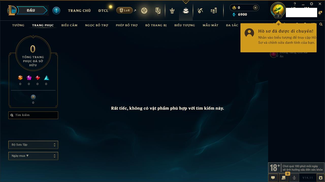 Rank Đơn: Chưa rank mùa nàoKhung: Chưa có khungTướng: 160 - Còn 9469 THXTrang Phục: 6Rank ĐTCL: Chưa RankLinh Thú: 64