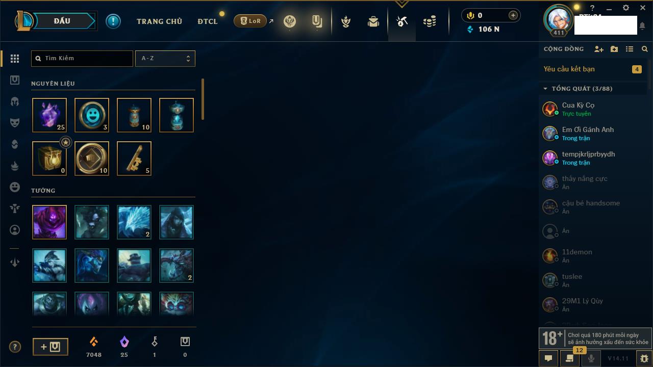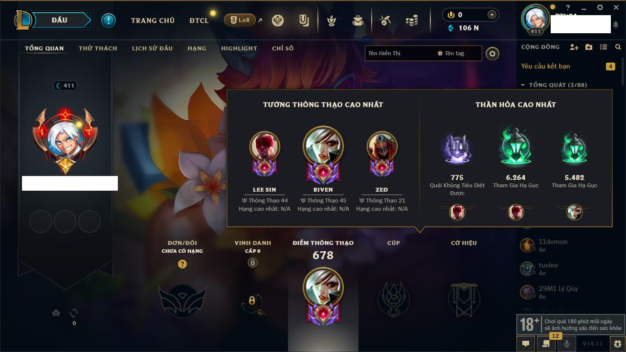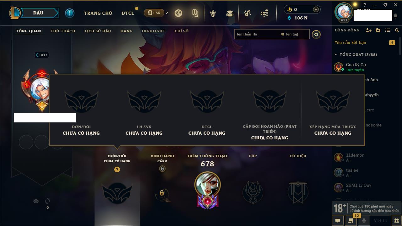 Rank Đơn: Vàng IKhung: BạcTướng: 171 - Còn 60584 THXTrang Phục: 286Rank ĐTCL: Vàng IIILinh Thú: 117
