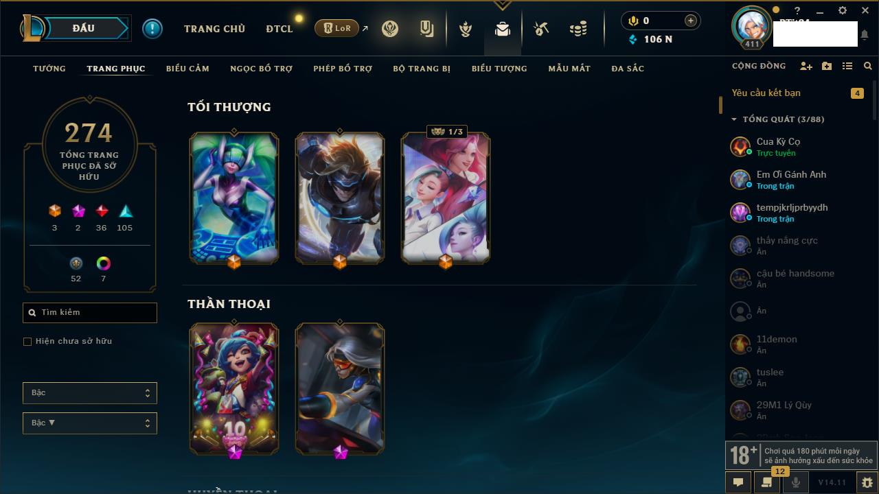Rank Đơn: Vàng IIIKhung: VàngTướng: 171 - Còn 88128 THXTrang Phục: 329Rank ĐTCL: Chưa RankLinh Thú: 41