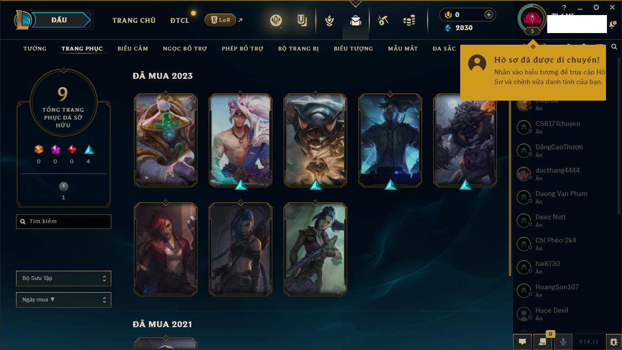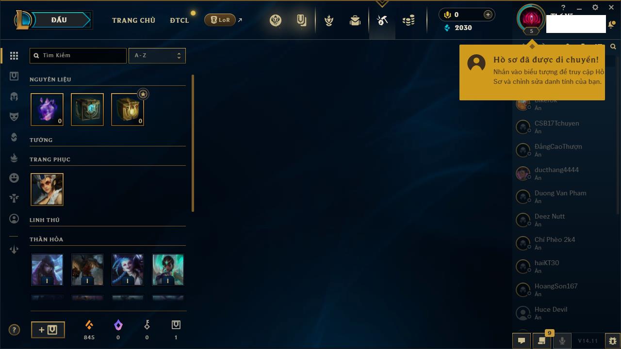Rank Đơn: Vàng IIIKhung: BạcTướng: 171 - Còn 101359 THXTrang Phục: 88Rank ĐTCL: Kim Cương IVLinh Thú: 200
