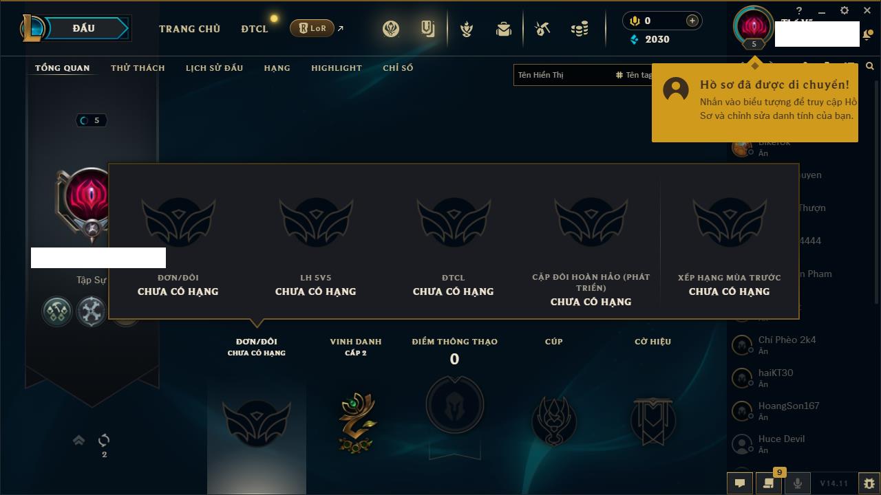 Rank Đơn: Đồng IIKhung: ĐồngTướng: 170 - Còn 66145 THXTrang Phục: 215Rank ĐTCL: Chưa RankLinh Thú: 52