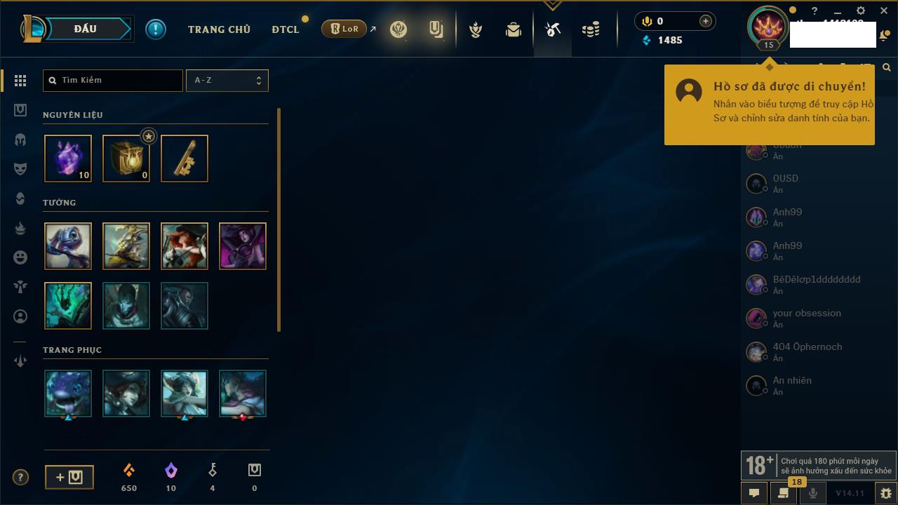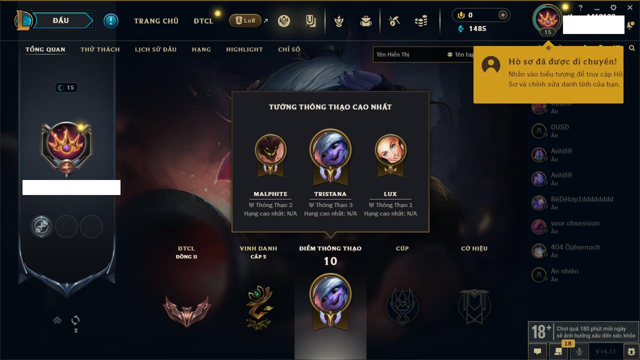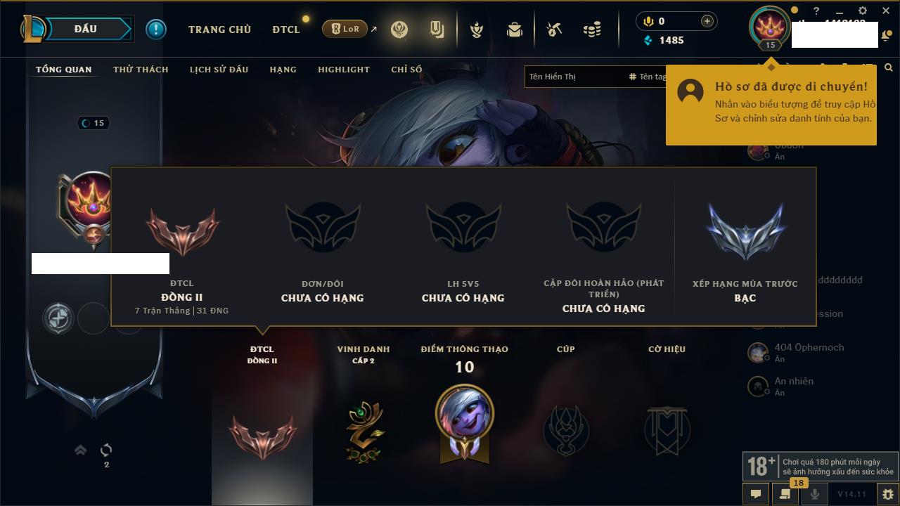 Rank Đơn: Chưa rank mùa nàoKhung: Chưa có khungTướng: 38 - Còn 6280 THXTrang Phục: 2Rank ĐTCL: Chưa RankLinh Thú: 50