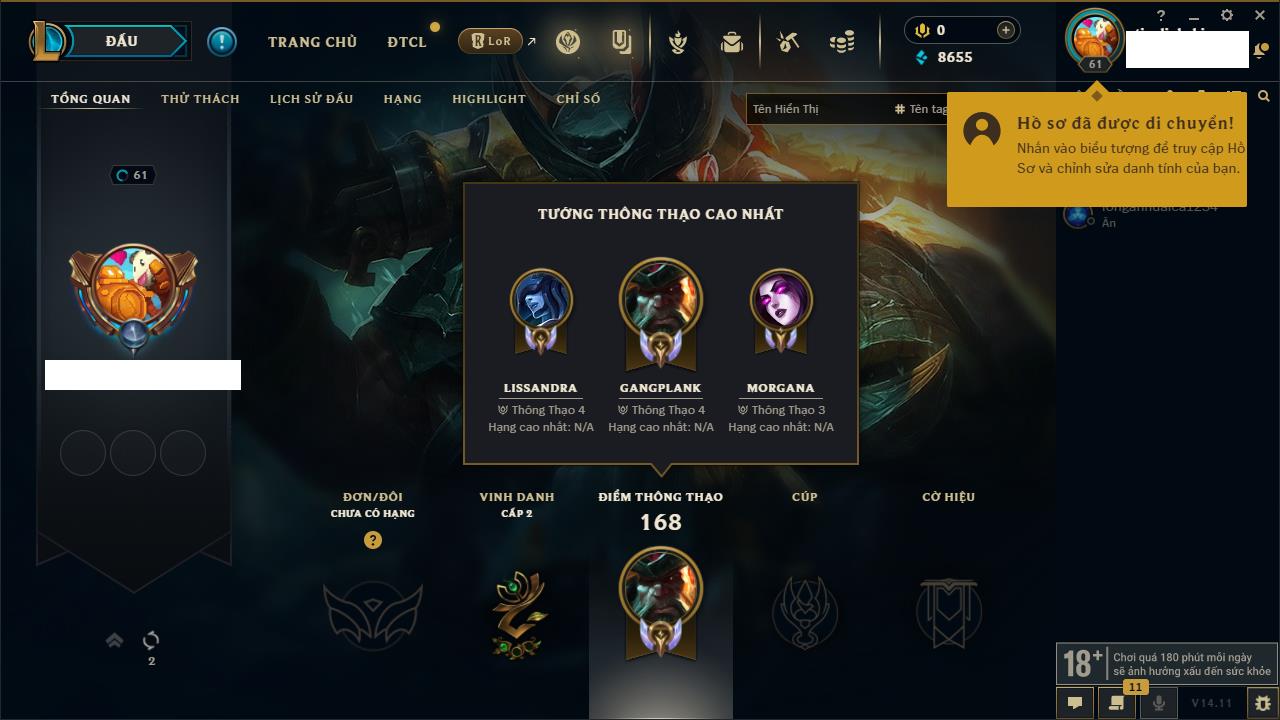 Rank Đơn: Chưa rank mùa nàoKhung: Chưa có khungTướng: 157 - Còn 19815 THXTrang Phục: 5Rank ĐTCL: Chưa RankLinh Thú: 134