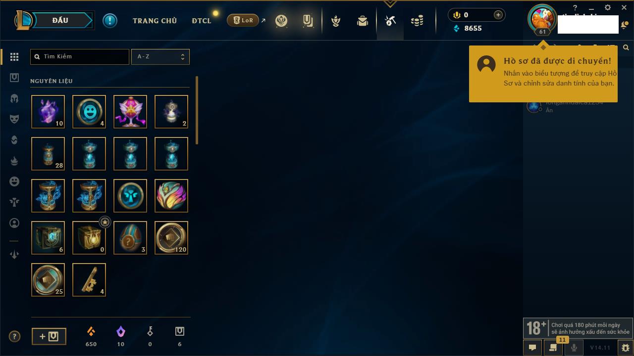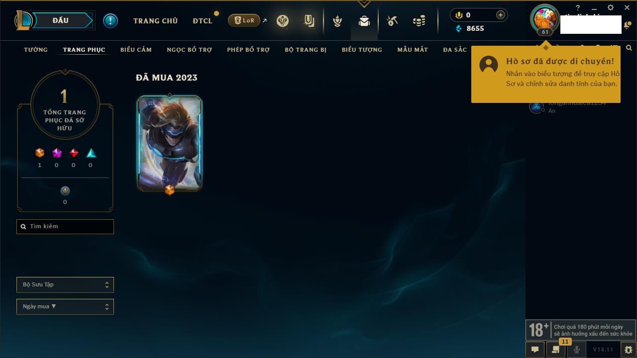 Rank Đơn: Chưa rank mùa nàoKhung: Chưa có khungTướng: 160 - Còn 9469 THXTrang Phục: 6Rank ĐTCL: Chưa RankLinh Thú: 64