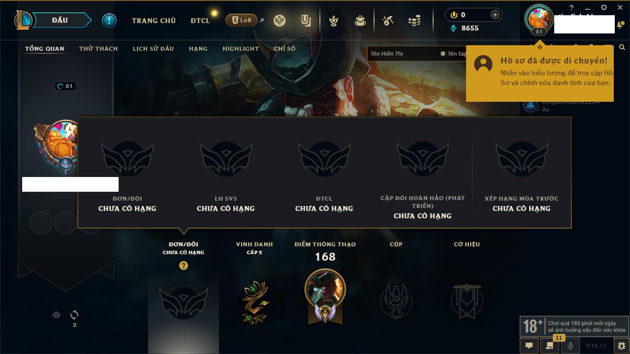 Rank Đơn: Chưa rank mùa nàoKhung: Chưa có khungTướng: 158 - Còn 8655 THXTrang Phục: 1Rank ĐTCL: Chưa RankLinh Thú: 4