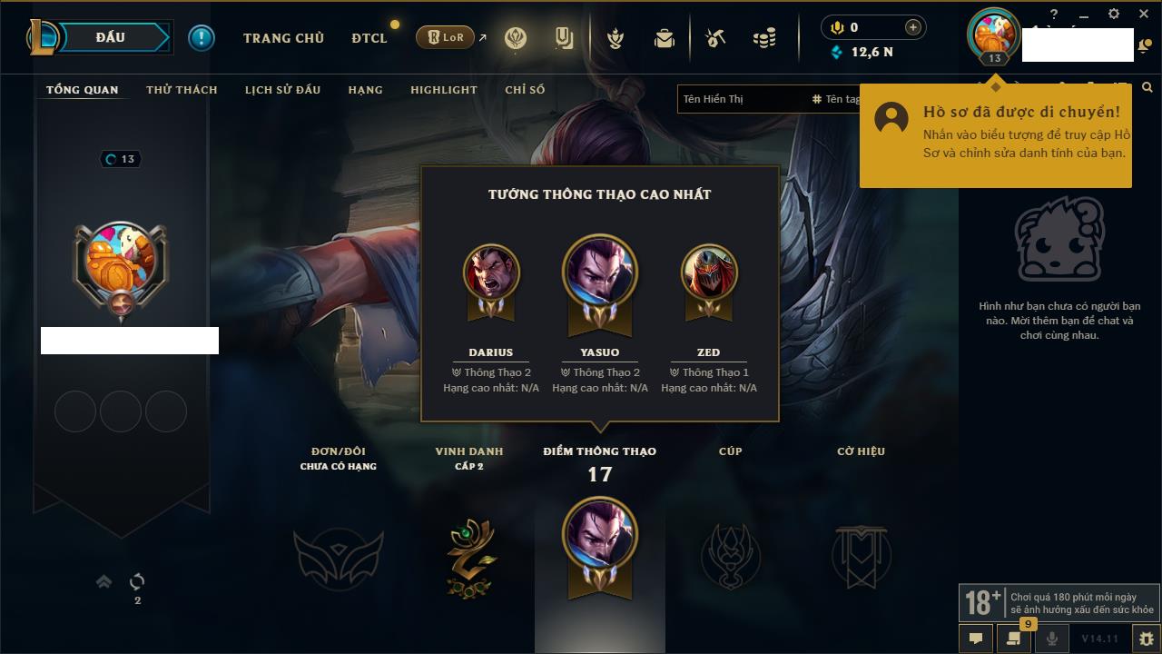 Rank Đơn: Chưa rank mùa nàoKhung: Chưa có khungTướng: 157 - Còn 12600 THXTrang Phục: 0Rank ĐTCL: Chưa RankLinh Thú: 2