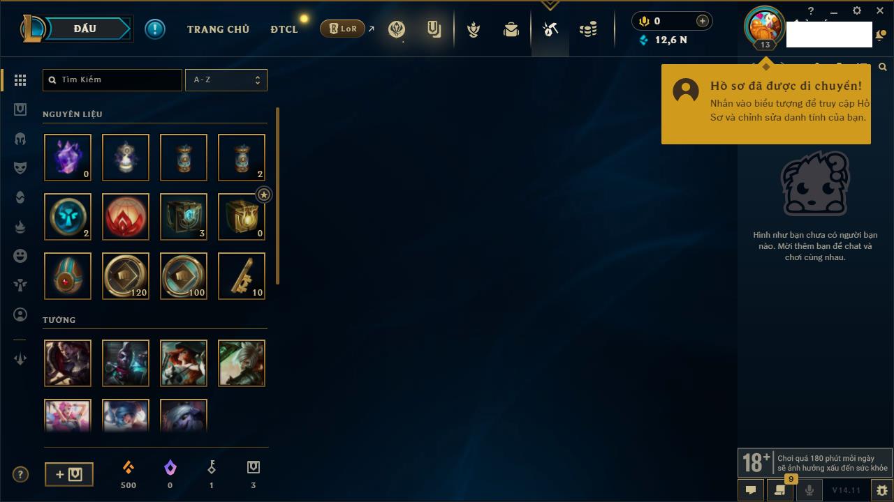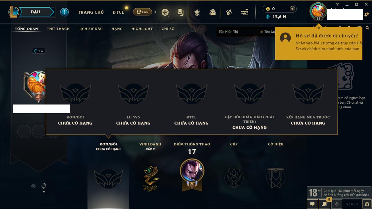 Rank Đơn: Chưa rank mùa nàoKhung: Chưa có khungTướng: 16 - Còn 9050 THXTrang Phục: 1Rank ĐTCL: Chưa RankLinh Thú: 14