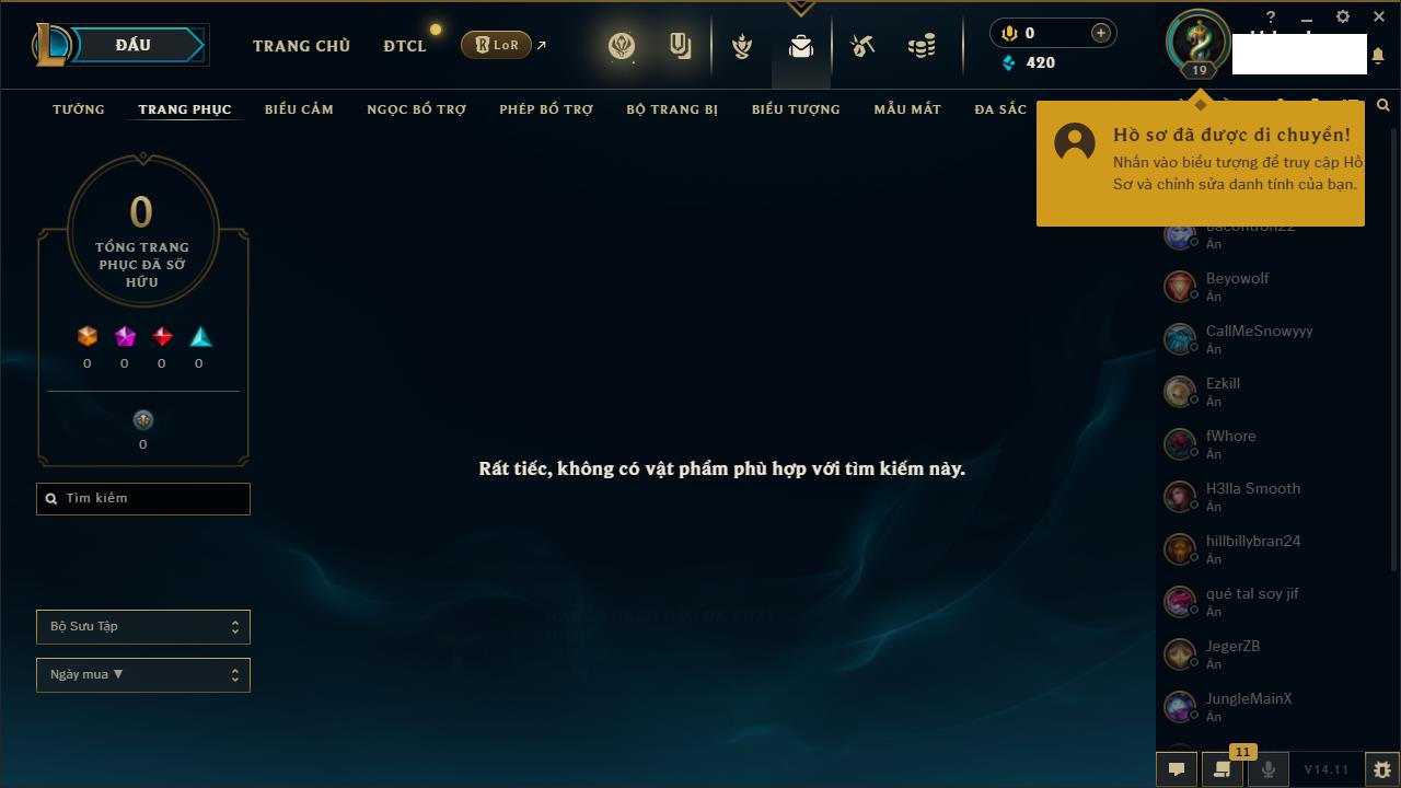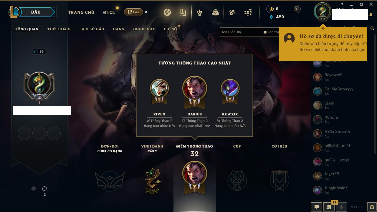Rank Đơn: Vàng IIIKhung: BạcTướng: 171 - Còn 101359 THXTrang Phục: 88Rank ĐTCL: Kim Cương IVLinh Thú: 200