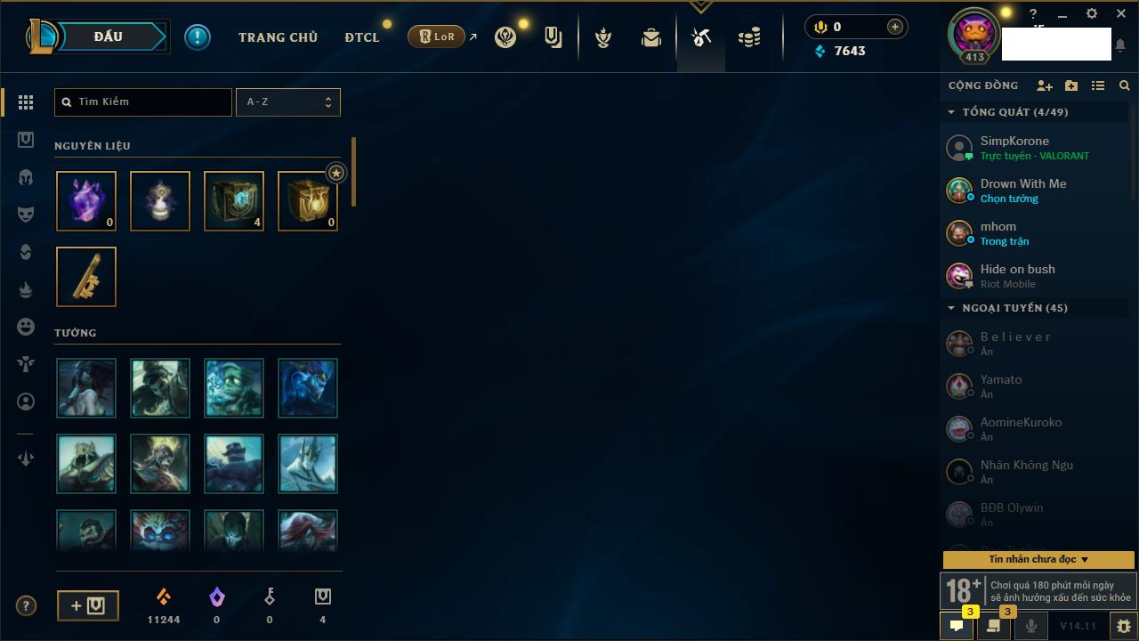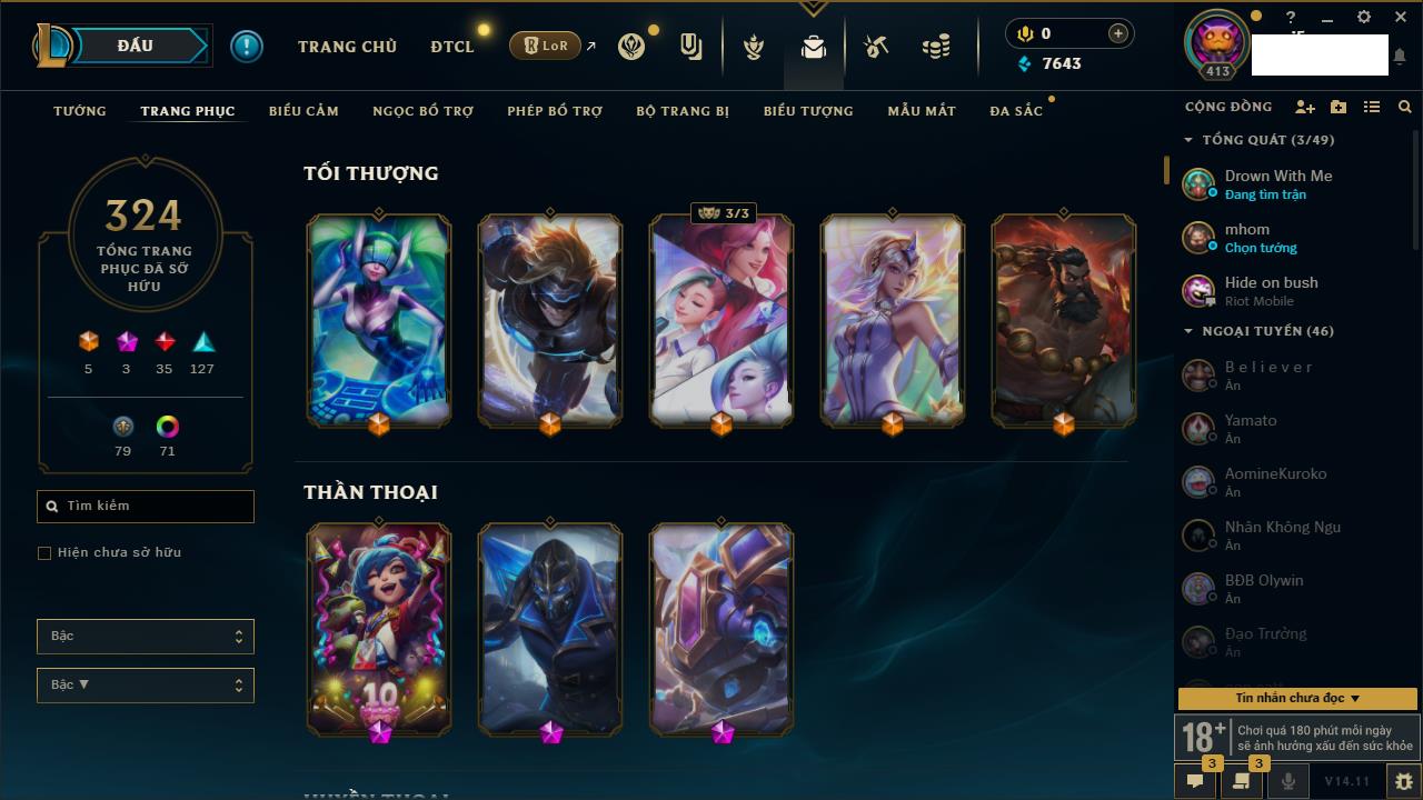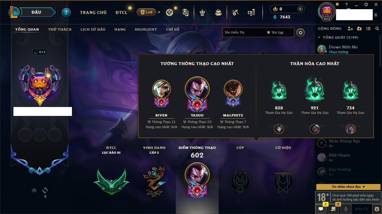 Rank Đơn: Bạc IIIKhung: BạcTướng: 170 - Còn 76760 THXTrang Phục: 235Rank ĐTCL: Chưa RankLinh Thú: 183