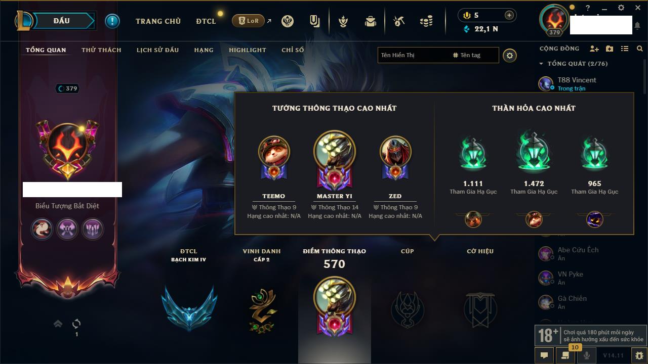Rank Đơn: Bạc IVKhung: BạcTướng: 171 - Còn 7819 THXTrang Phục: 243Rank ĐTCL: Chưa RankLinh Thú: 102