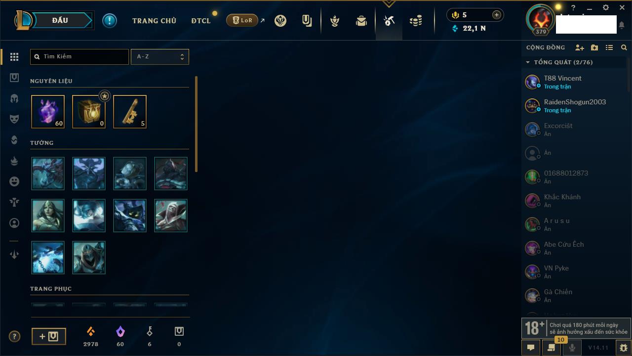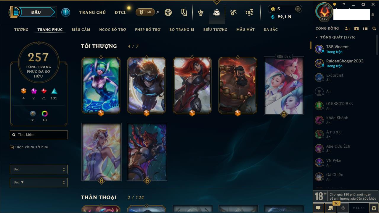 Rank Đơn: Vàng IIKhung: VàngTướng: 171 - Còn 34018 THXTrang Phục: 250Rank ĐTCL: Sắt IILinh Thú: 19
