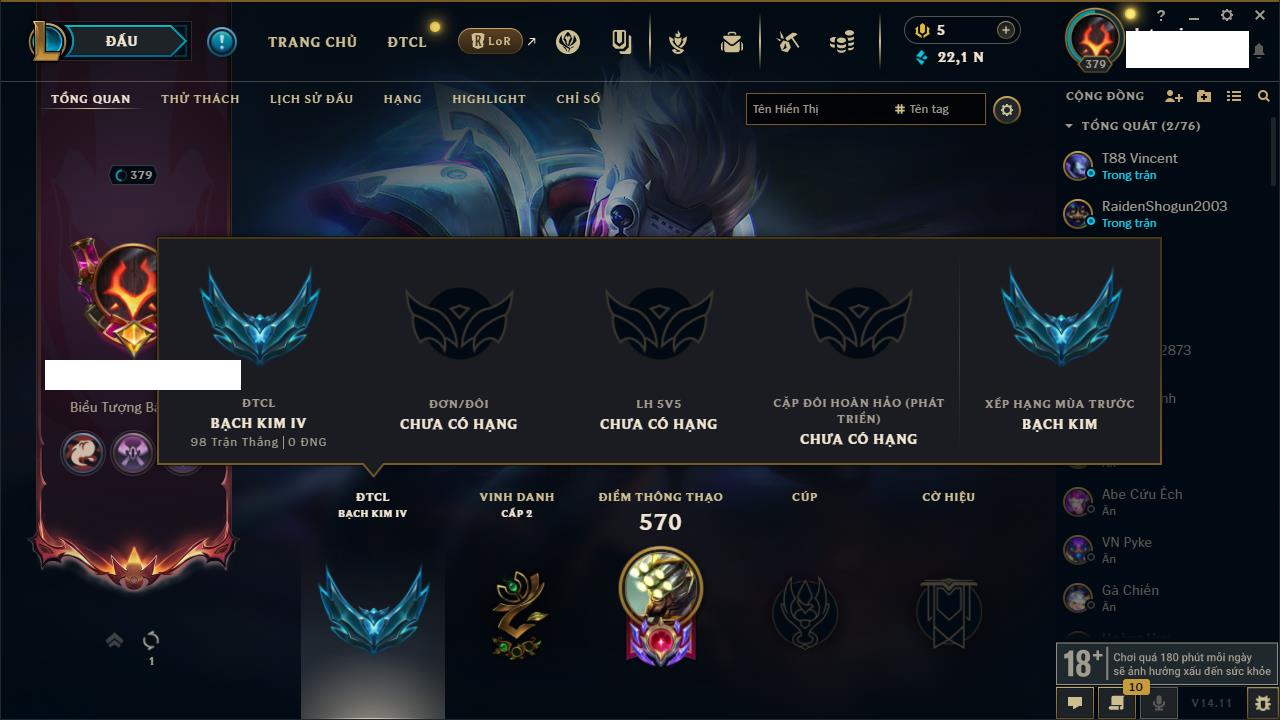 Rank Đơn: Bạc IIIKhung: Chưa có khungTướng: 171 - Còn 21493 THXTrang Phục: 252Rank ĐTCL: Bạch Kim IVLinh Thú: 123