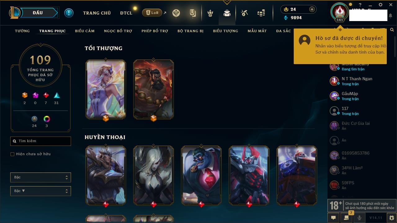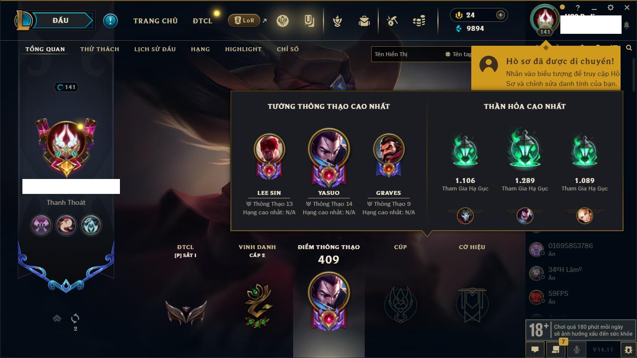 Rank Đơn: Vàng IVKhung: Chưa có khungTướng: 169 - Còn 2148 THXTrang Phục: 205Rank ĐTCL: Chưa RankLinh Thú: 50