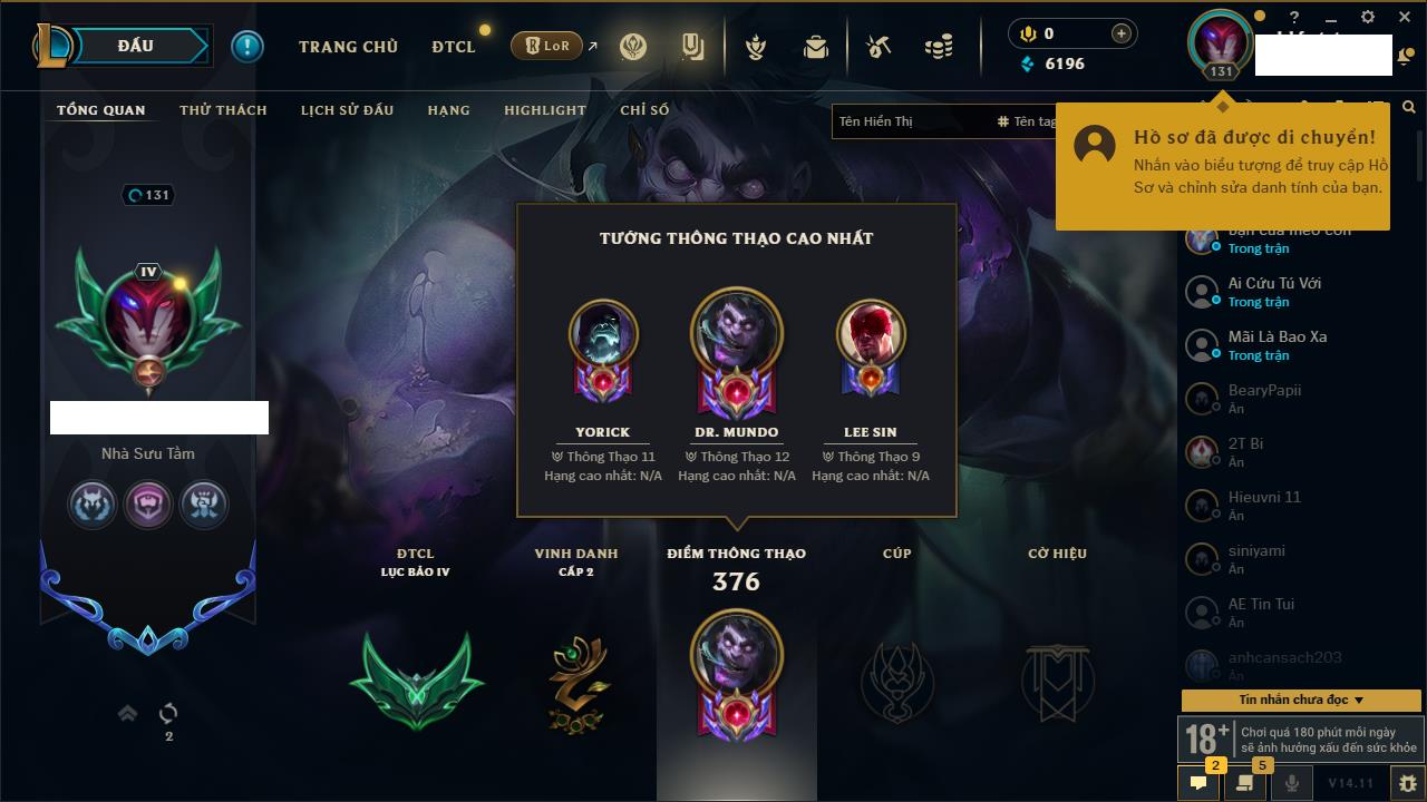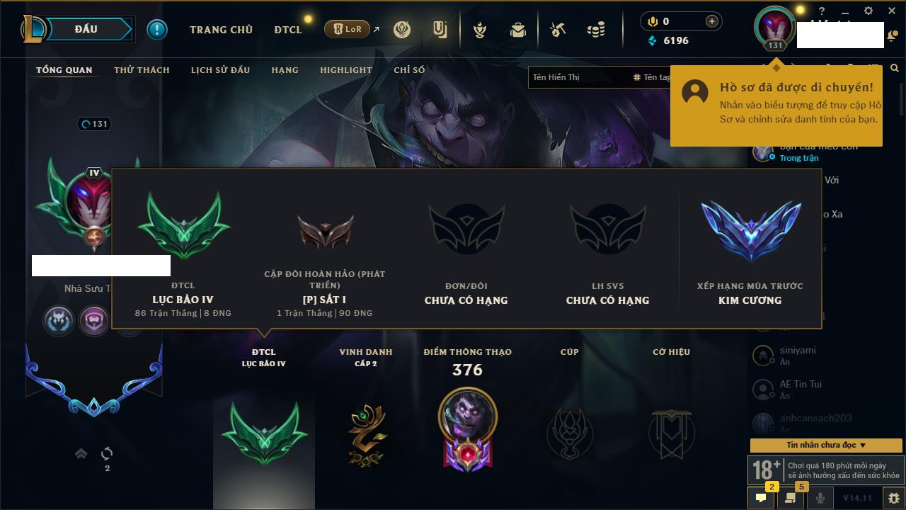 Rank Đơn: Vàng IKhung: BạcTướng: 171 - Còn 60584 THXTrang Phục: 286Rank ĐTCL: Vàng IIILinh Thú: 117