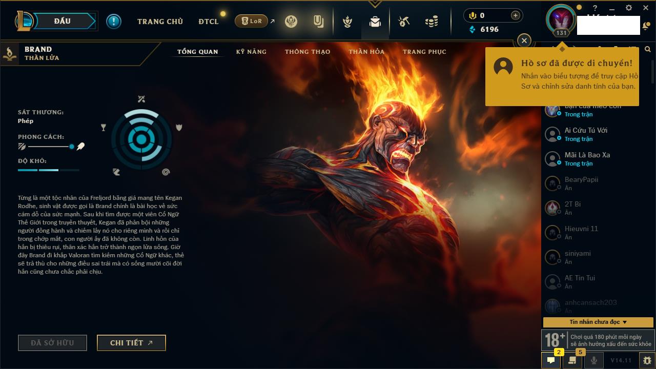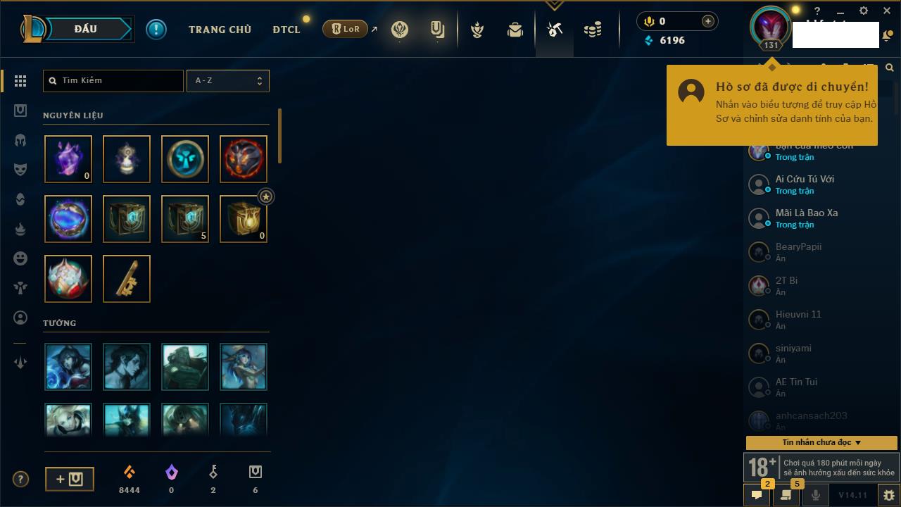 Rank Đơn: Vàng IIIKhung: VàngTướng: 171 - Còn 88128 THXTrang Phục: 329Rank ĐTCL: Chưa RankLinh Thú: 41